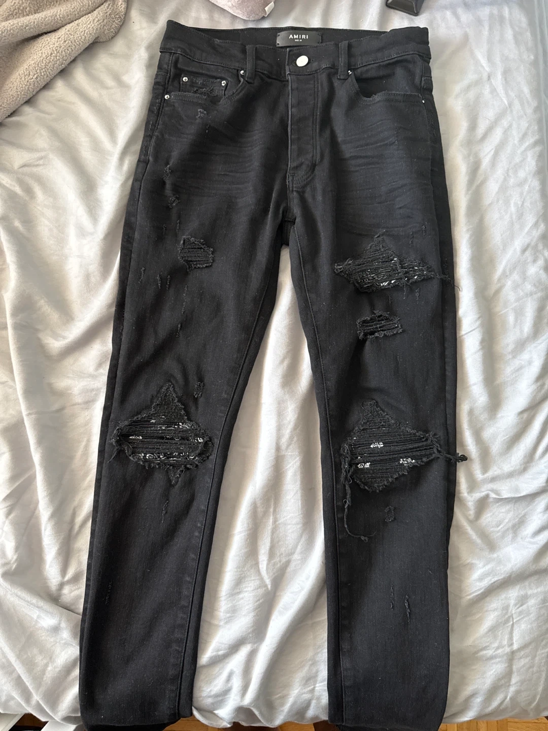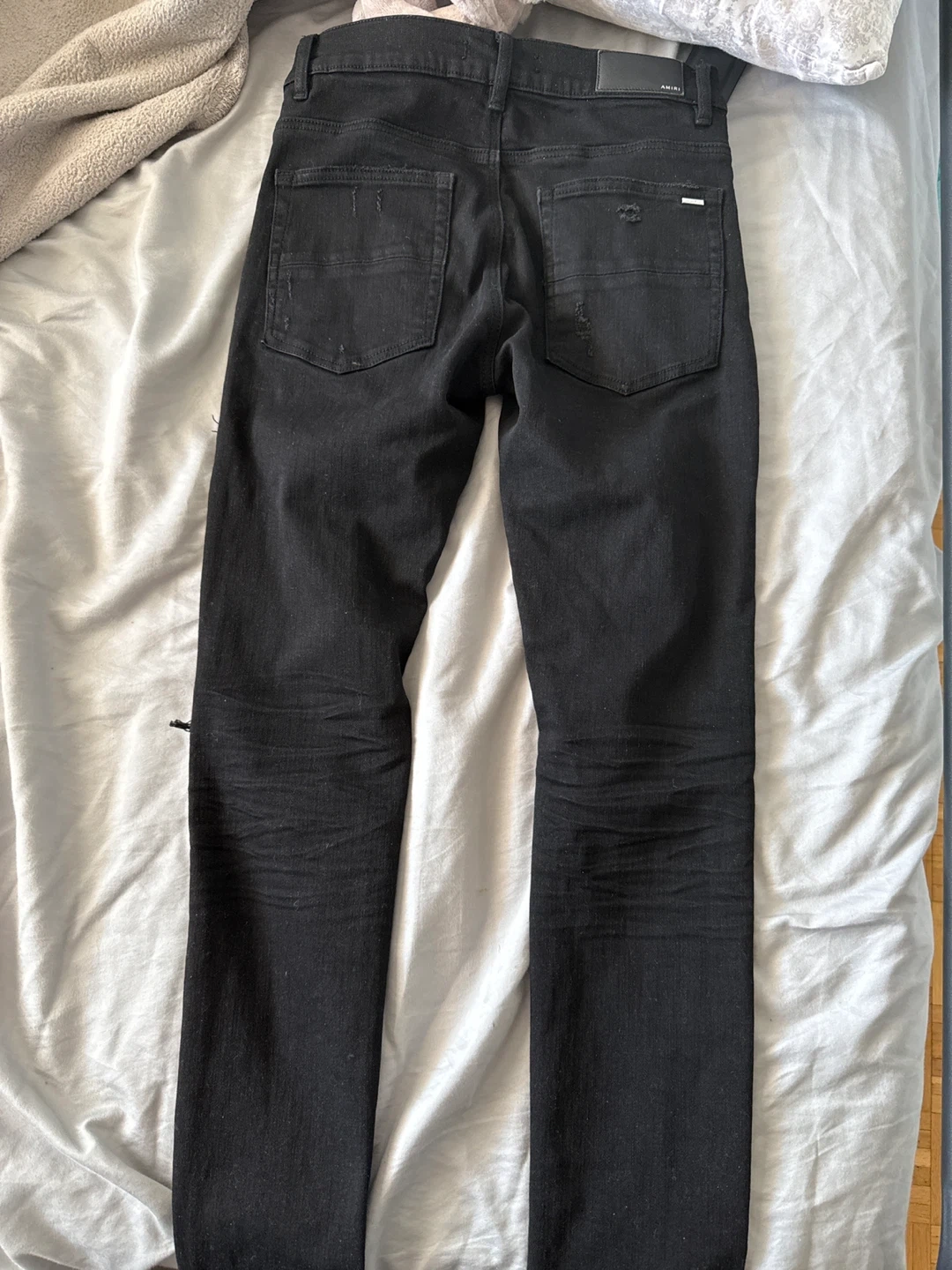 Authentic AMIRI black distressed jeans, size 31, in good condition. Original factory distressing only β no additional rips or damage. Clean, well maintained, and from a smoke-free home.
