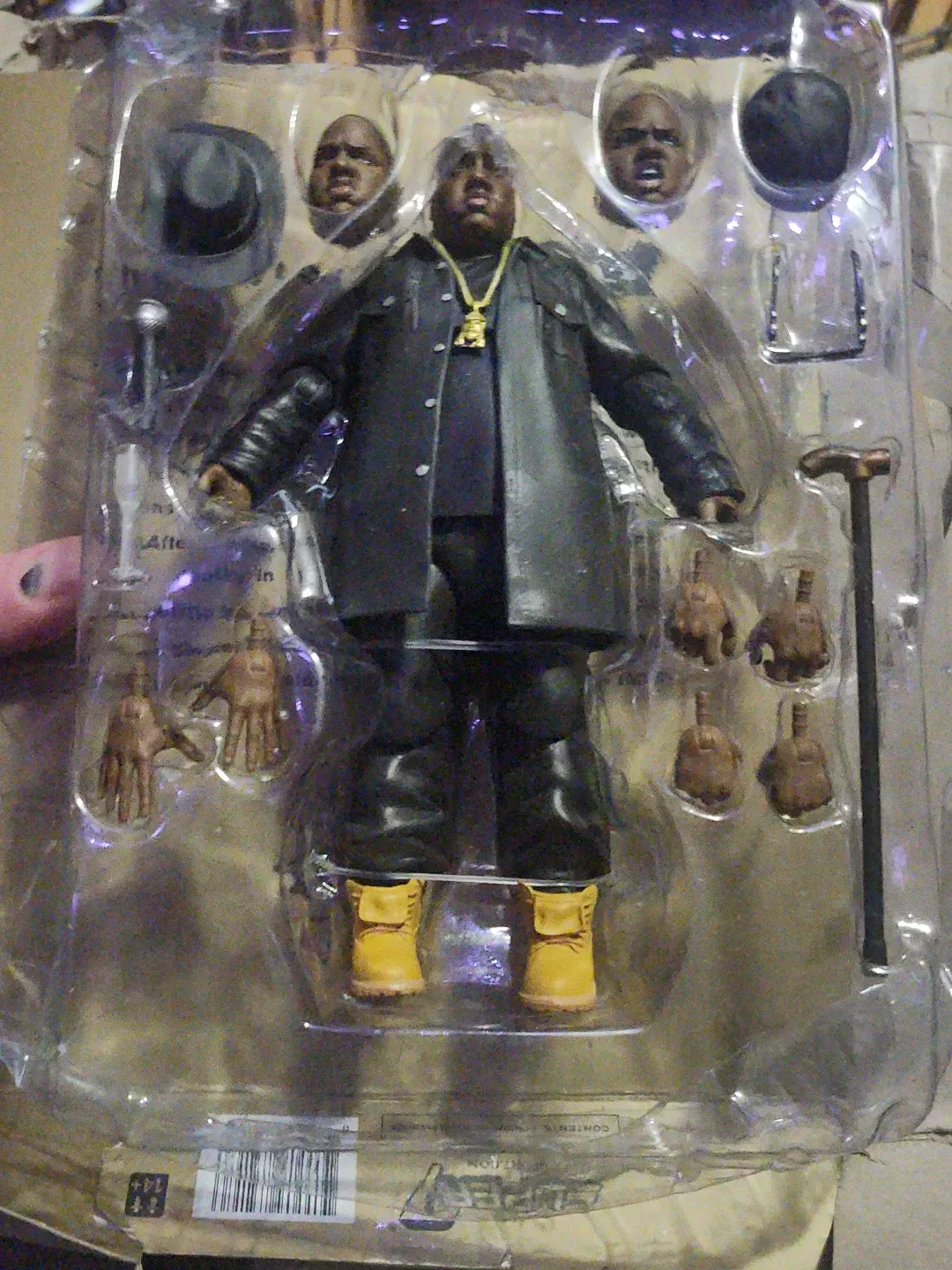 Selling a Super7 Notorious B.I.G. action figure. It includes accessories such as alternate heads, hands, a hat, cane, and microphone. The figure comes in its original packaging outer box has some damage