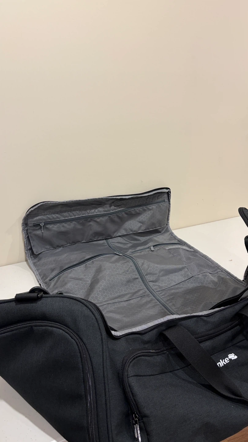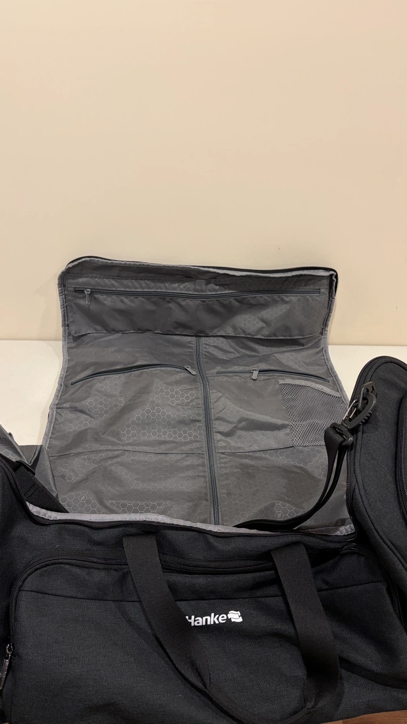 This Hanke duffel bag is black with a textured finish. It features a fold-out garment bag section with zippered pockets inside. It's suitable for carrying clothes and essentials on trips.