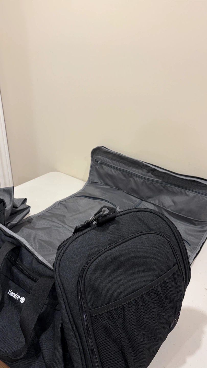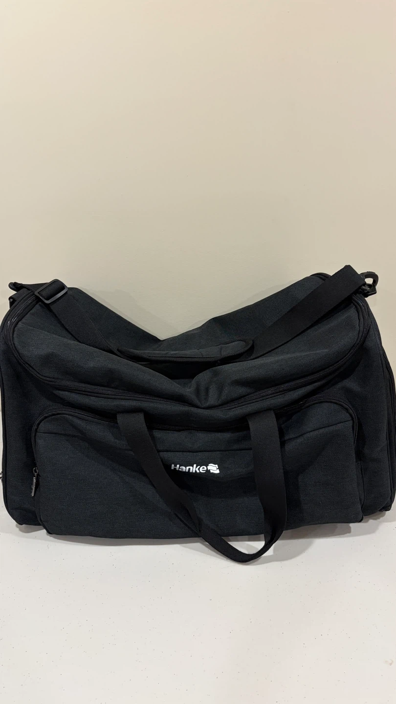 This Hanke duffel bag is black with a textured finish. It features a fold-out garment bag section with zippered pockets inside. It's suitable for carrying clothes and essentials on trips.