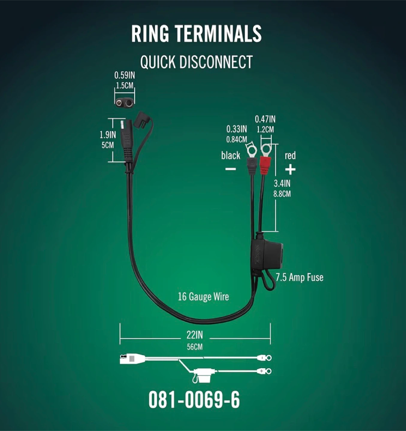 This is a Battery Tender quick disconnect ring terminal harness with 16 gauge wire. It's 18 inches long and features a 7.5 Amp fuse. Useful for easily connecting and disconnecting battery chargers to your vehicle's battery.