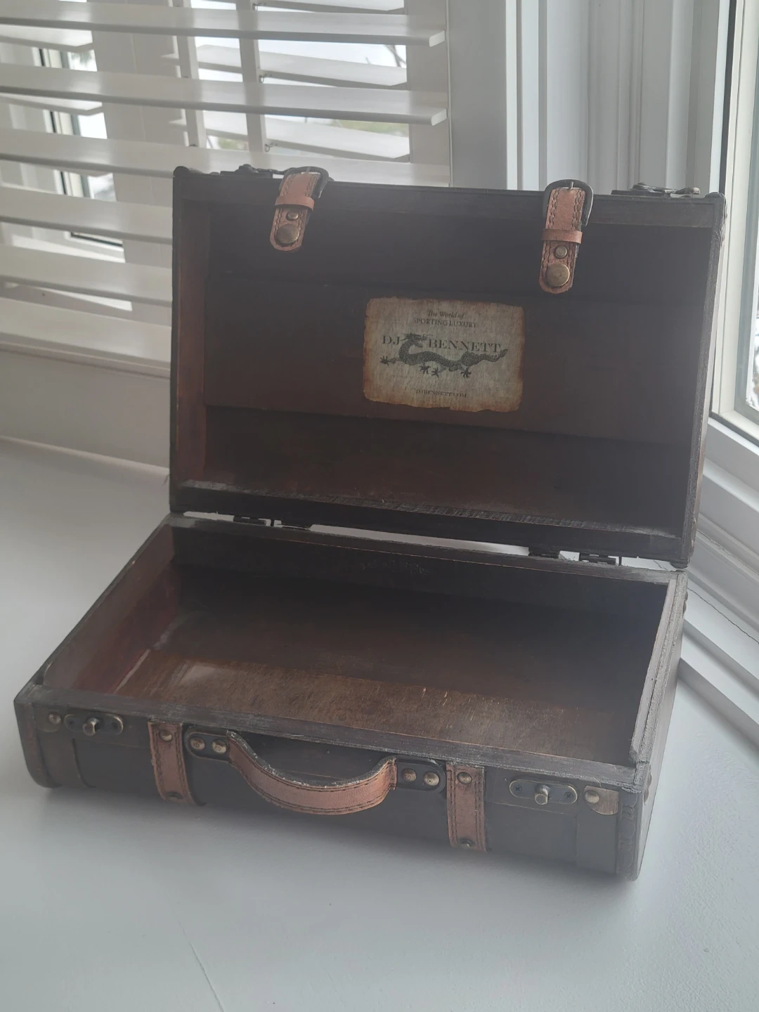 Add a touch of vintage charm to your home decor with this used DJ Bennett suitcase! The suitcase features a classic design with leather straps and metal hardware, perfect for adding a rustic touch to any room. This suitcase is in good condition.