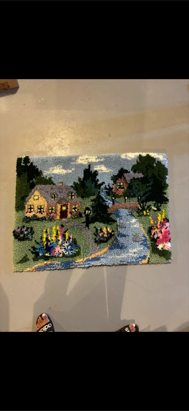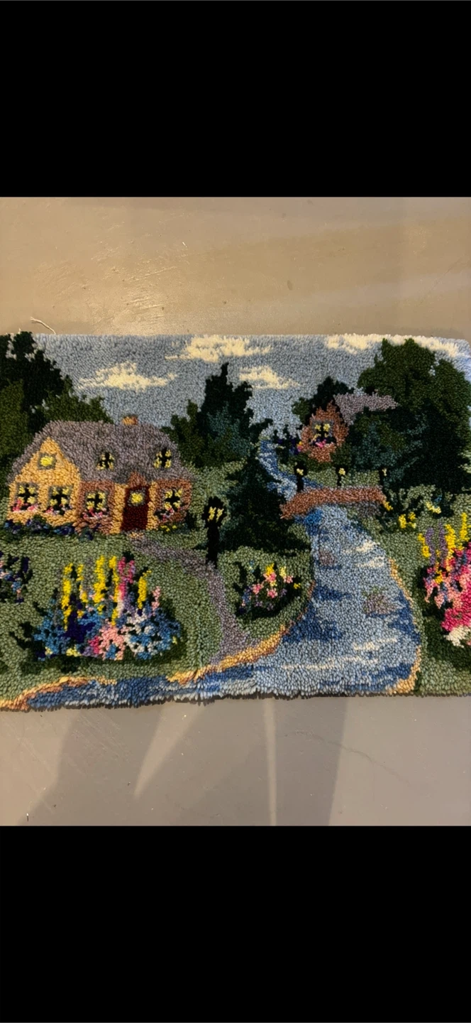 This is a vintage rug hooking kit featuring a charming countryside scene. It depicts a yellow house with a red door, a winding blue stream, and colourful flowers. The backing appears to be a white mesh material, ready for completion. It's a lovely piece for home decor to use as a rug or tapestry.