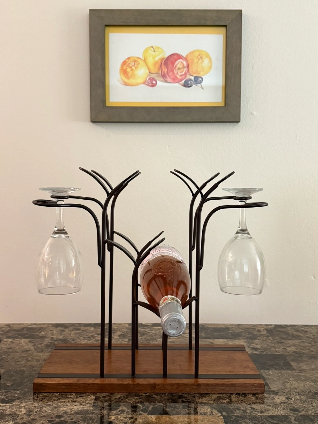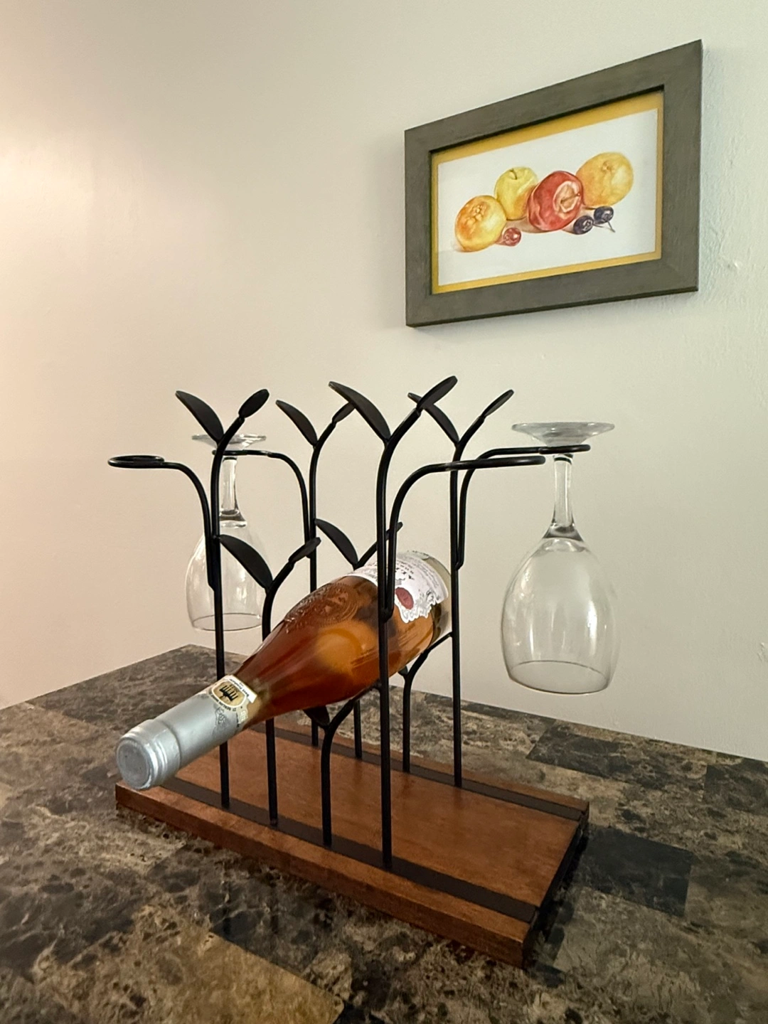 This is a lovely wine rack that also holds wine glasses. It has a wooden base with a metal frame. It's perfect for displaying your favorite bottle of wine and glasses.