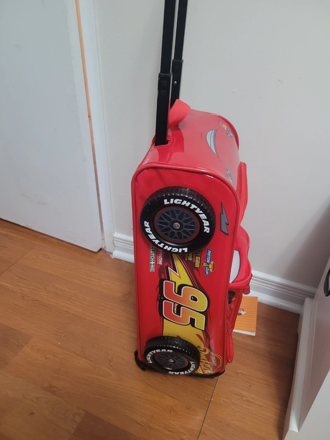 Here's a super cute Disney Pixar Cars rolling luggage! It's red and features Lightning McQueen. Perfect for your little one's next adventure