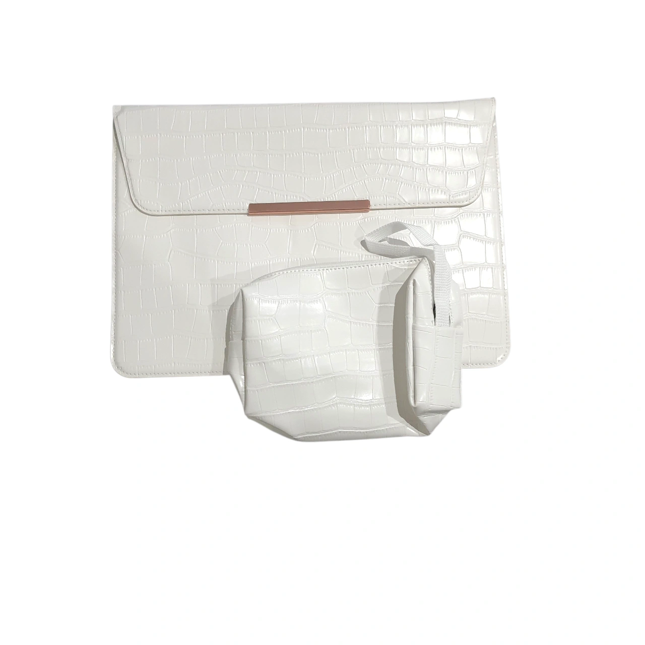 A white faux crocodile laptop bag set. It includes a larger envelope-style clutch sleeve with magnetic snap closure, and a smaller accessories pouch. Shiny, structured material.