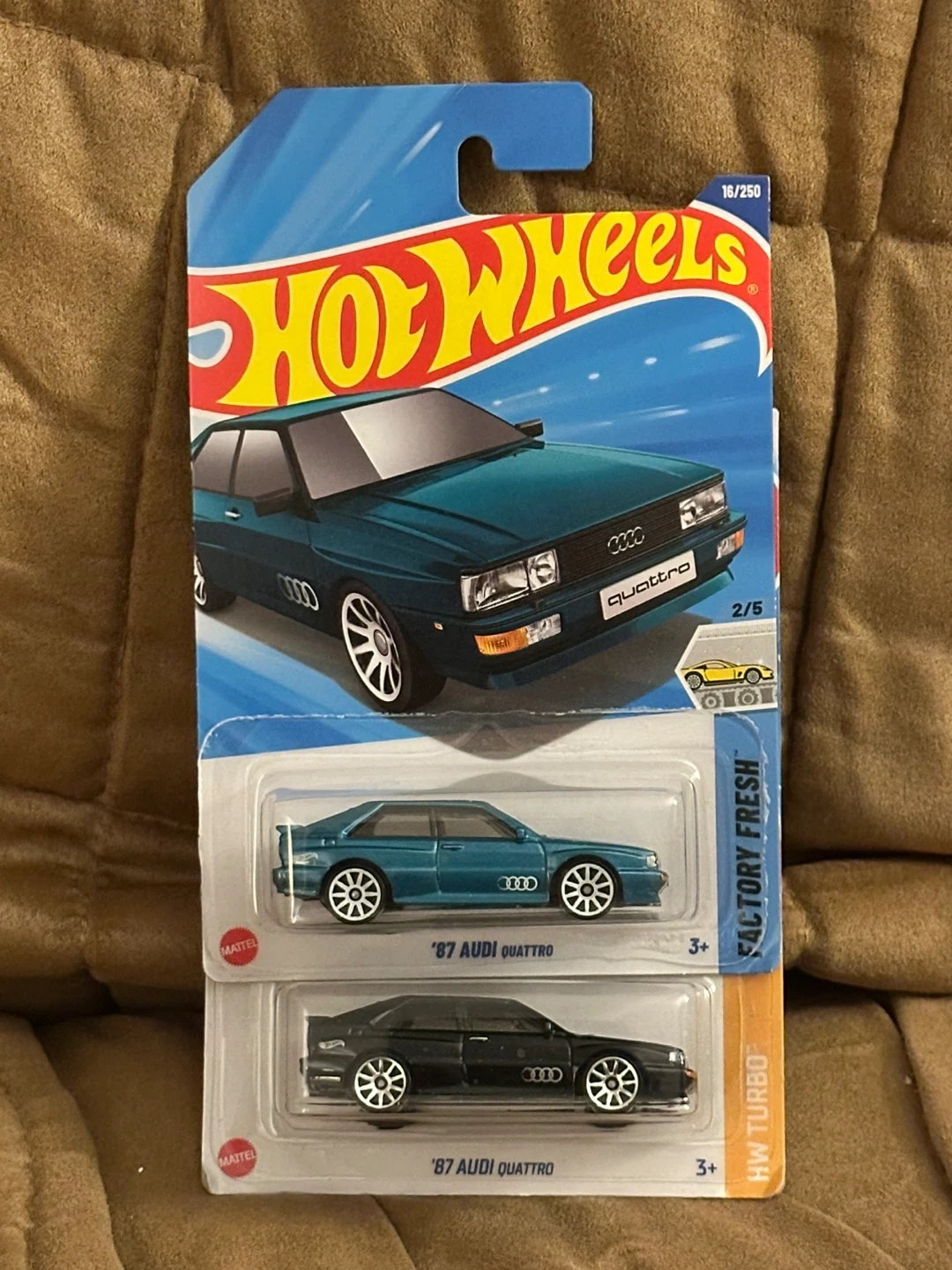 Two Hot Wheels '87 Audi Quattro diecast cars. One teal and one black. Part of the Factory Fresh series.
