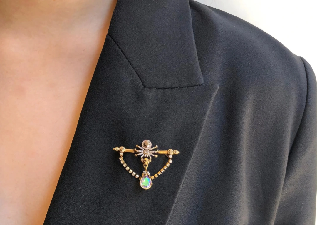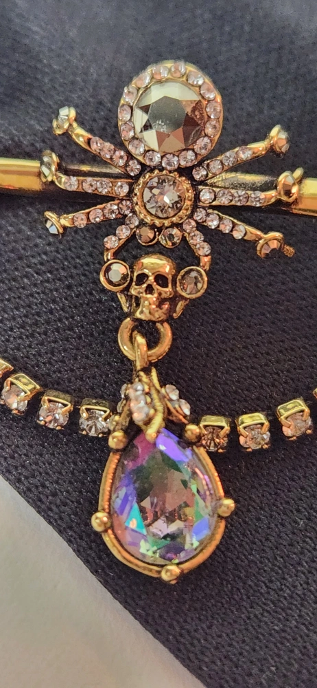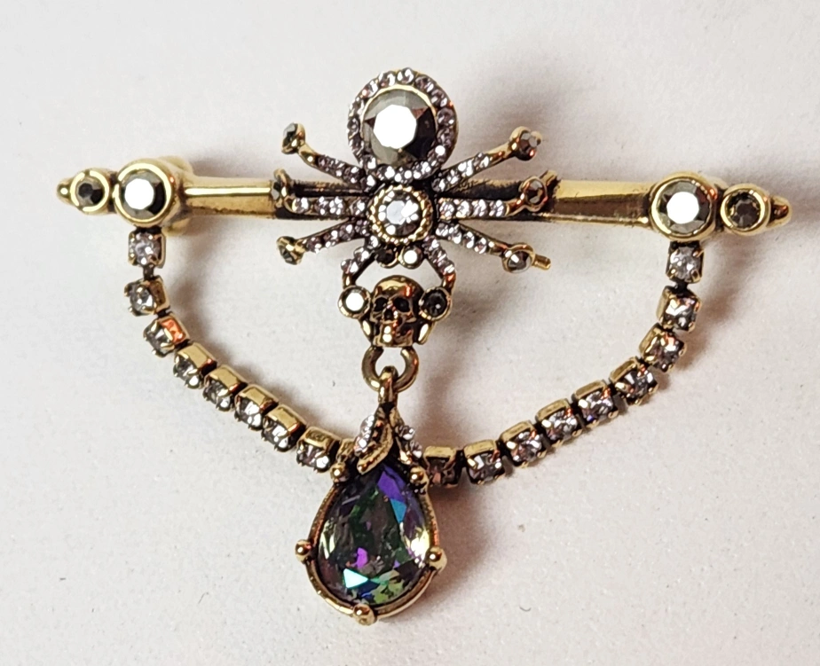 Antique gold-finished spider brooch, adorned with Swarovski crystals and signature skull.