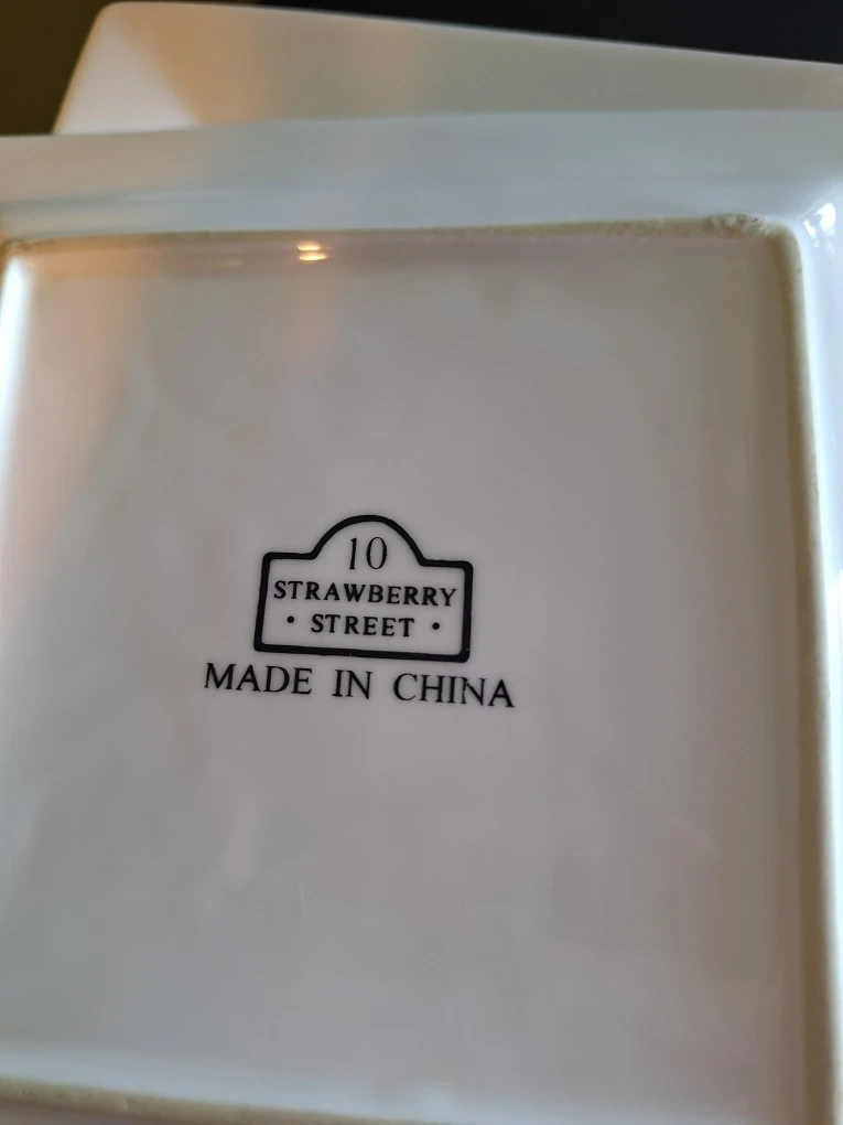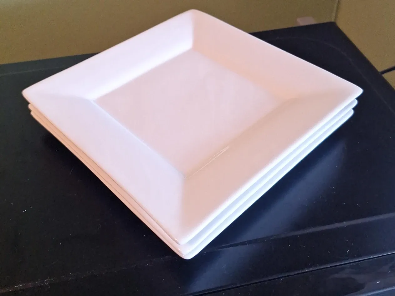 Set of three white square dinner plates. These durable plates are perfect for everyday use or special occasions. They're a classic addition to any kitchenware collection!
