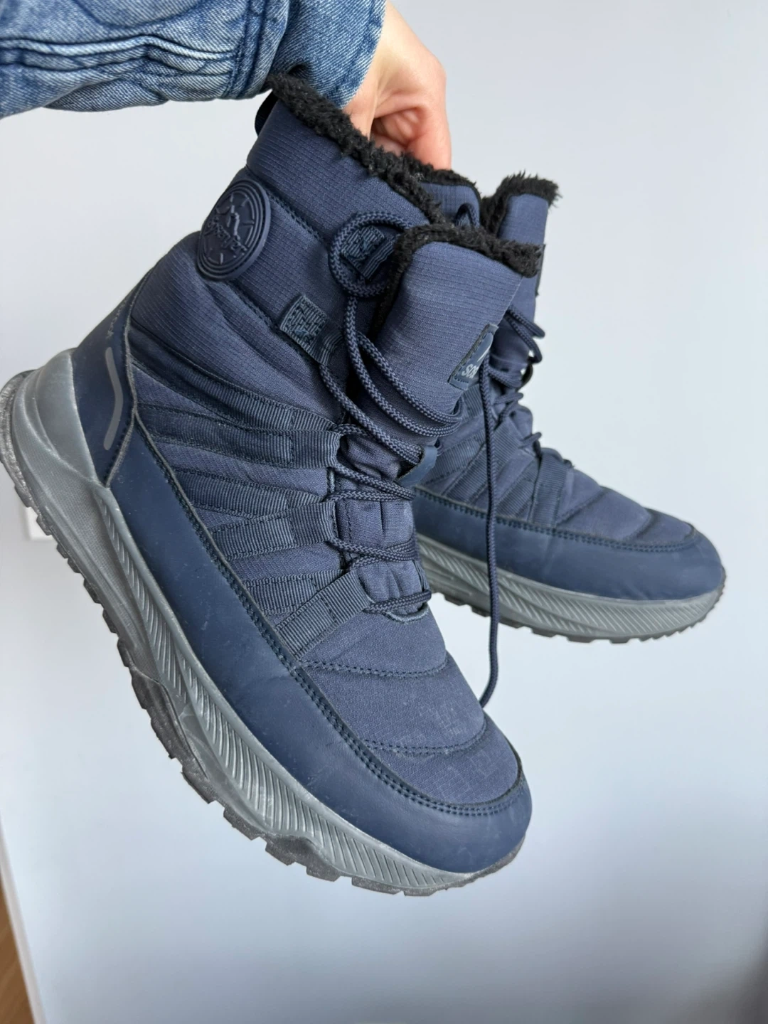 These SOSENFER boots are navy blue and waterproof, perfect for winter weather. They feature a warm, furry lining for extra comfort. Ideal for staying cozy and dry during snow or rain!