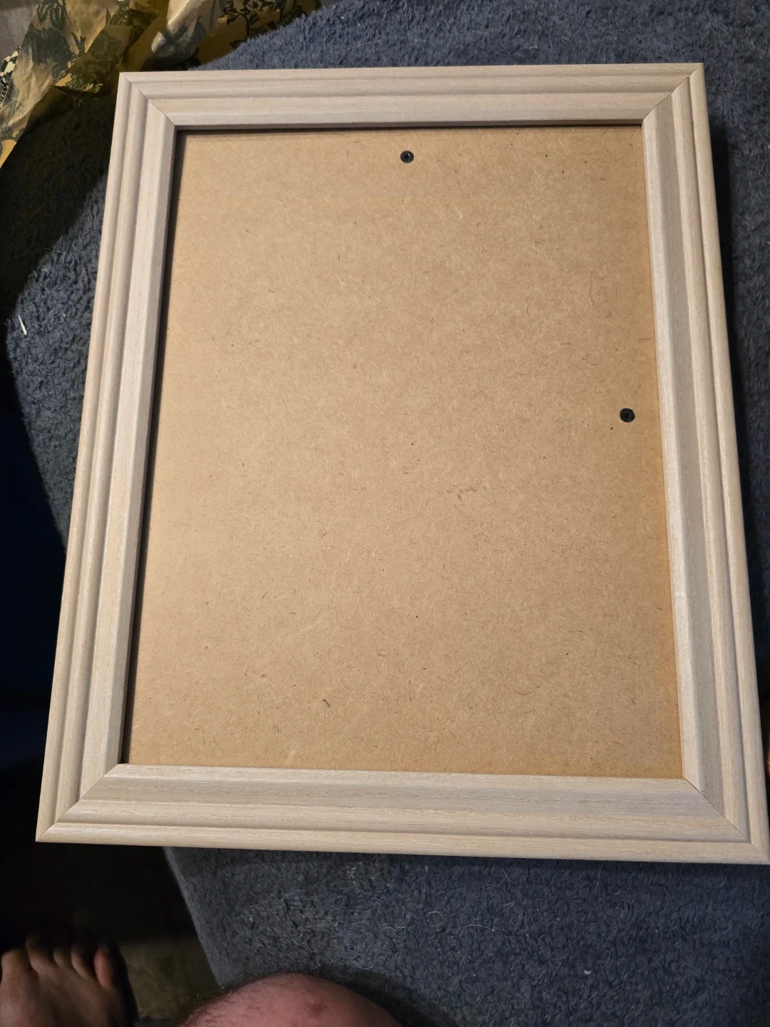 This is a light-coloured wooden picture frame. It's designed to hold photos or artwork. It's a simple frame for displaying memories!