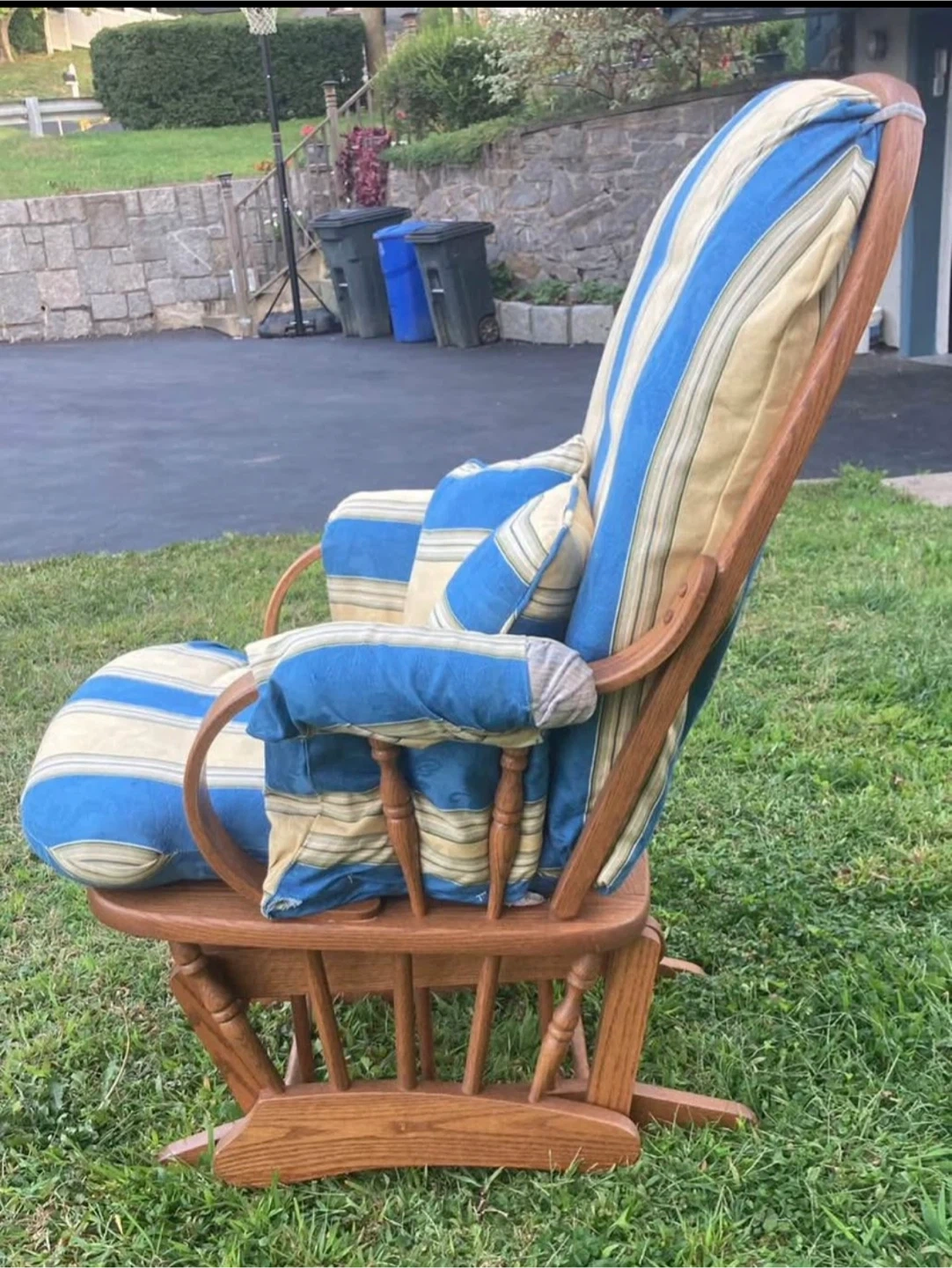 Wooden glider rocker chair featuring comfortable, upholstered cushions. The cushions have a blue and beige striped pattern with accent pillows. It's made of wood with a natural finish. Offers a gentle rocking motion. Price is negotiable.Cash only .
