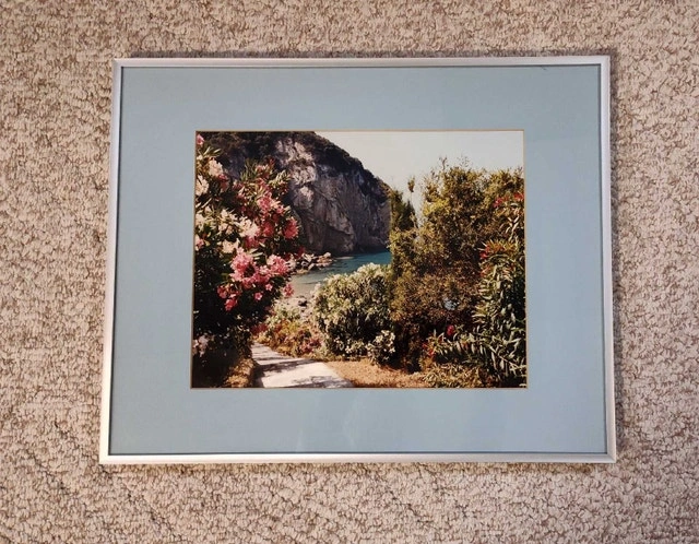 This framed photo captures a serene tropical island scene, complete with lush foliage and a glimpse of the turquoise sea. The photograph is mounted in a sleek, silver-tone frame that complements the vibrant colours of the print. The piece is in good condition, ready to hang and bring a touch of paradise to your space. The picture captures an idyllic view of the Mediterranean. Frame is approximately 20" x 16" inches. Comes with framing mat, and you can easy replace the photo with your own preference. Pick up in Lisgar area of Mississauga.