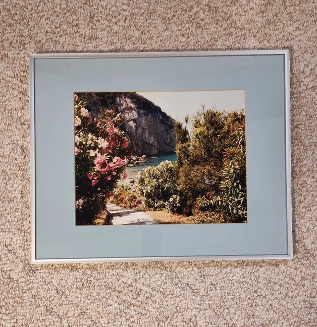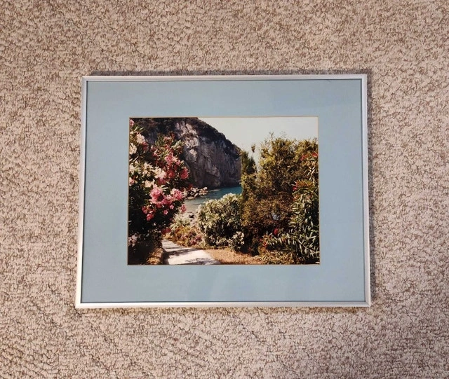 This framed photo captures a serene tropical island scene, complete with lush foliage and a glimpse of the turquoise sea. The photograph is mounted in a sleek, silver-tone frame that complements the vibrant colours of the print. The piece is in good condition, ready to hang and bring a touch of paradise to your space. The picture captures an idyllic view of the Mediterranean. Frame is approximately 20" x 16" inches. Comes with framing mat, and you can easy replace the photo with your own preference. Pick up in Lisgar area of Mississauga.