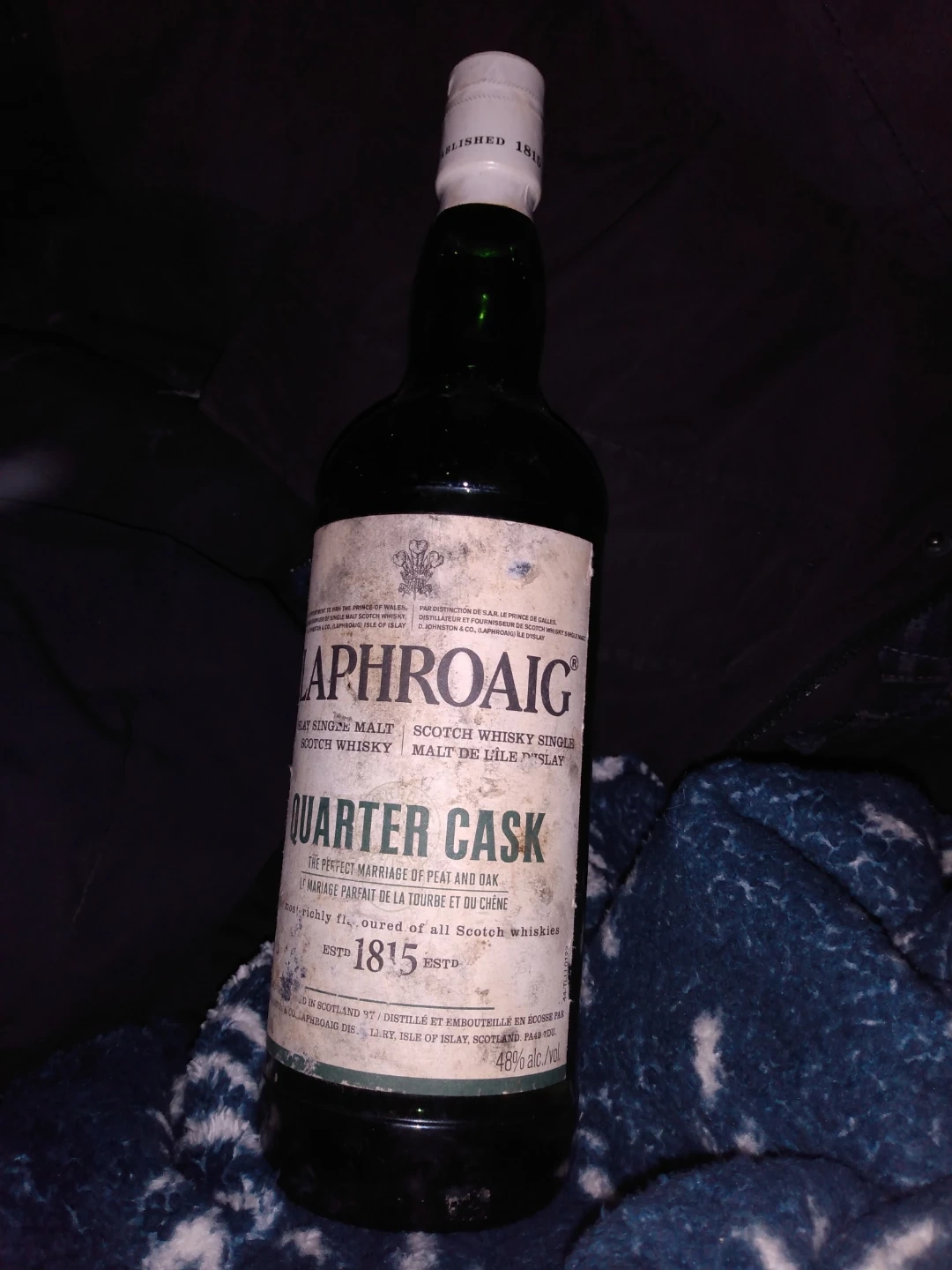 This is a bottle of Laphroaig Quarter Cask Single Malt Scotch Whisky. It's noted as the perfect marriage of peat and oak. Established in 1815, this whisky has a strength of 48% alcohol by volume. Its rich flavour comes from maturation in ex-bourbon barrels with a quarter cask finish.