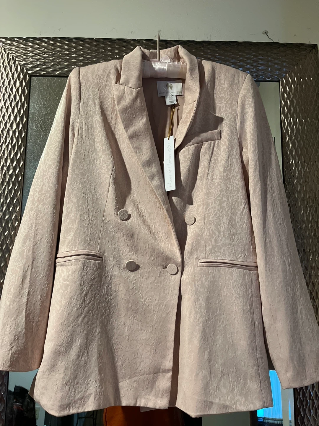 This is a pink blazer from House of Harlow 1960. It's a double-breasted style with button closures. The fabric has a subtle embossed pattern. This blazer adds a touch of elegance to any outfit!