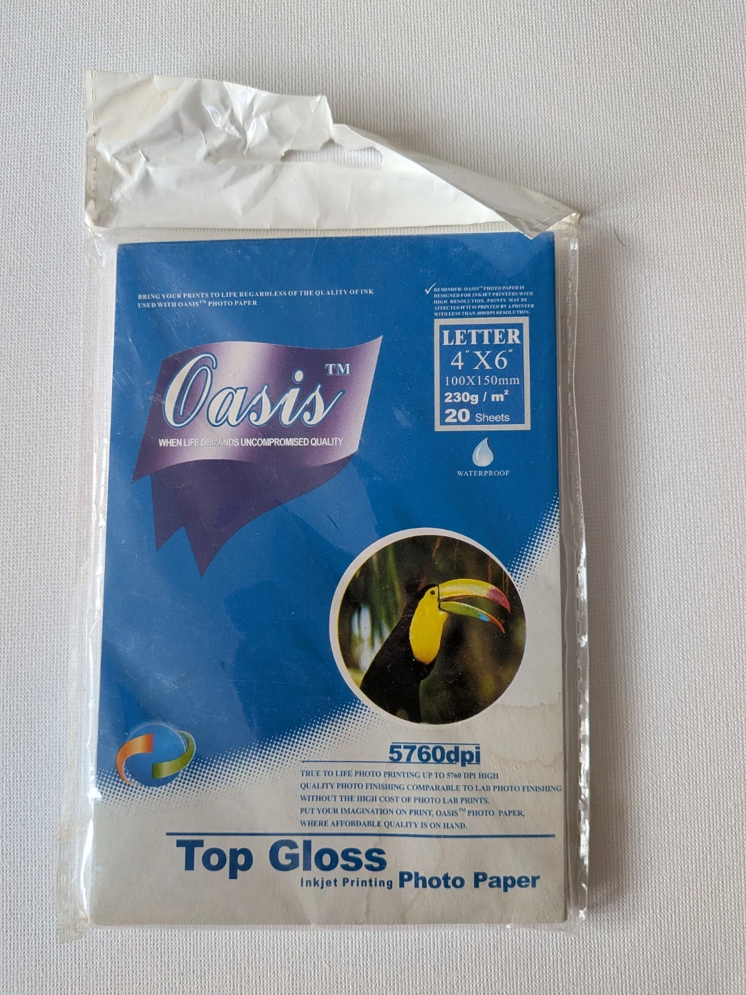 This is Oasis Top Gloss inkjet photo paper. It's a 4x6 inch size, with 20 sheets included. The paper is 230g/m² and waterproof. It's designed for high-quality photo printing up to 5760dpi.