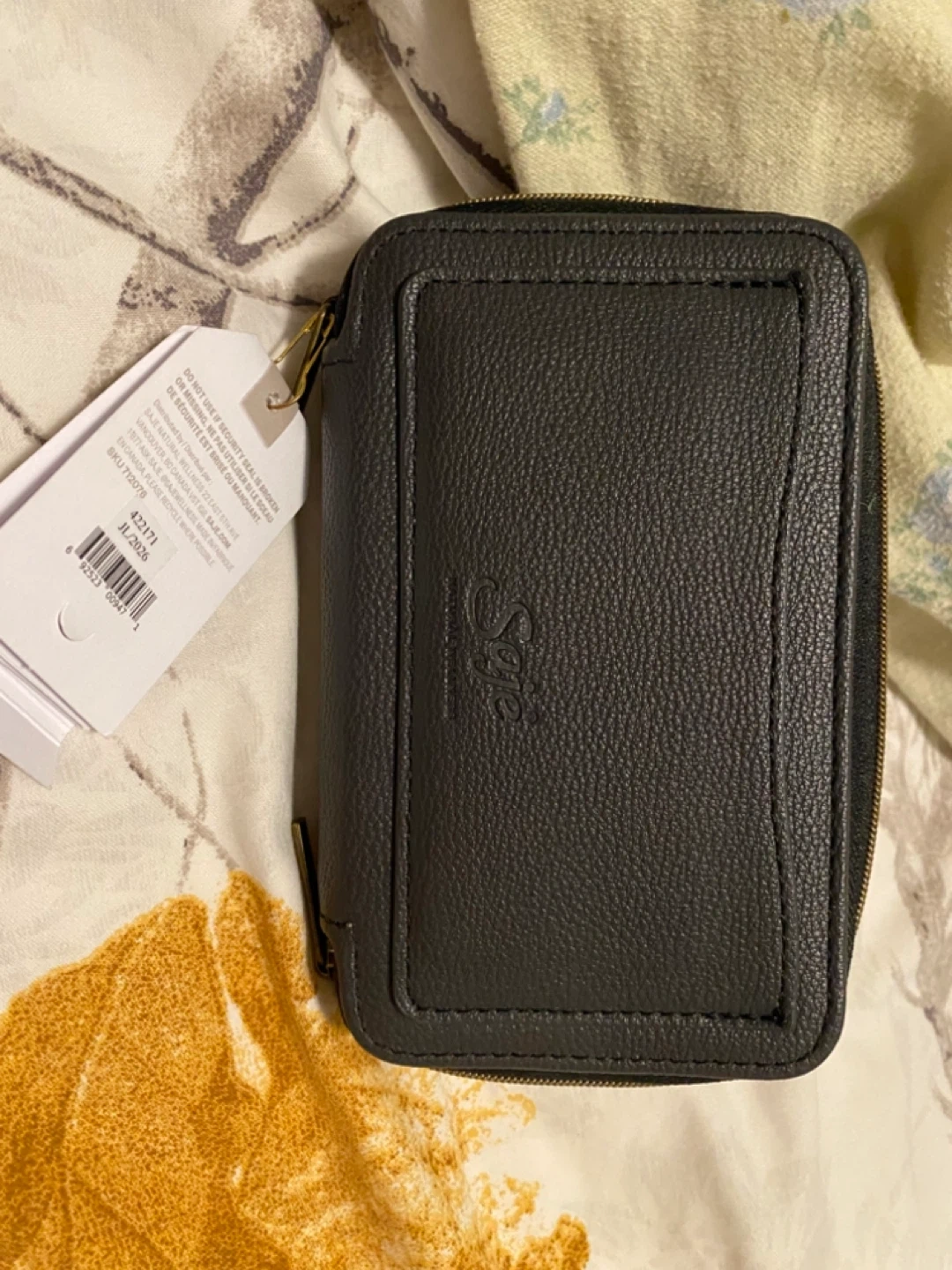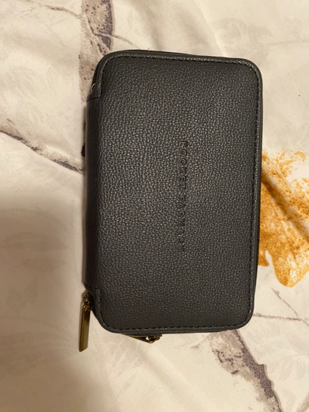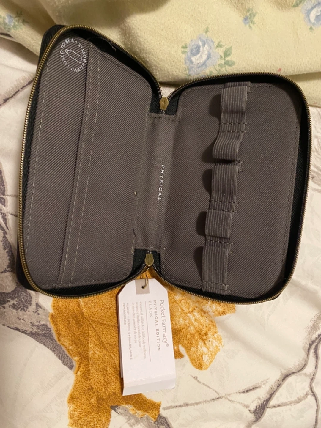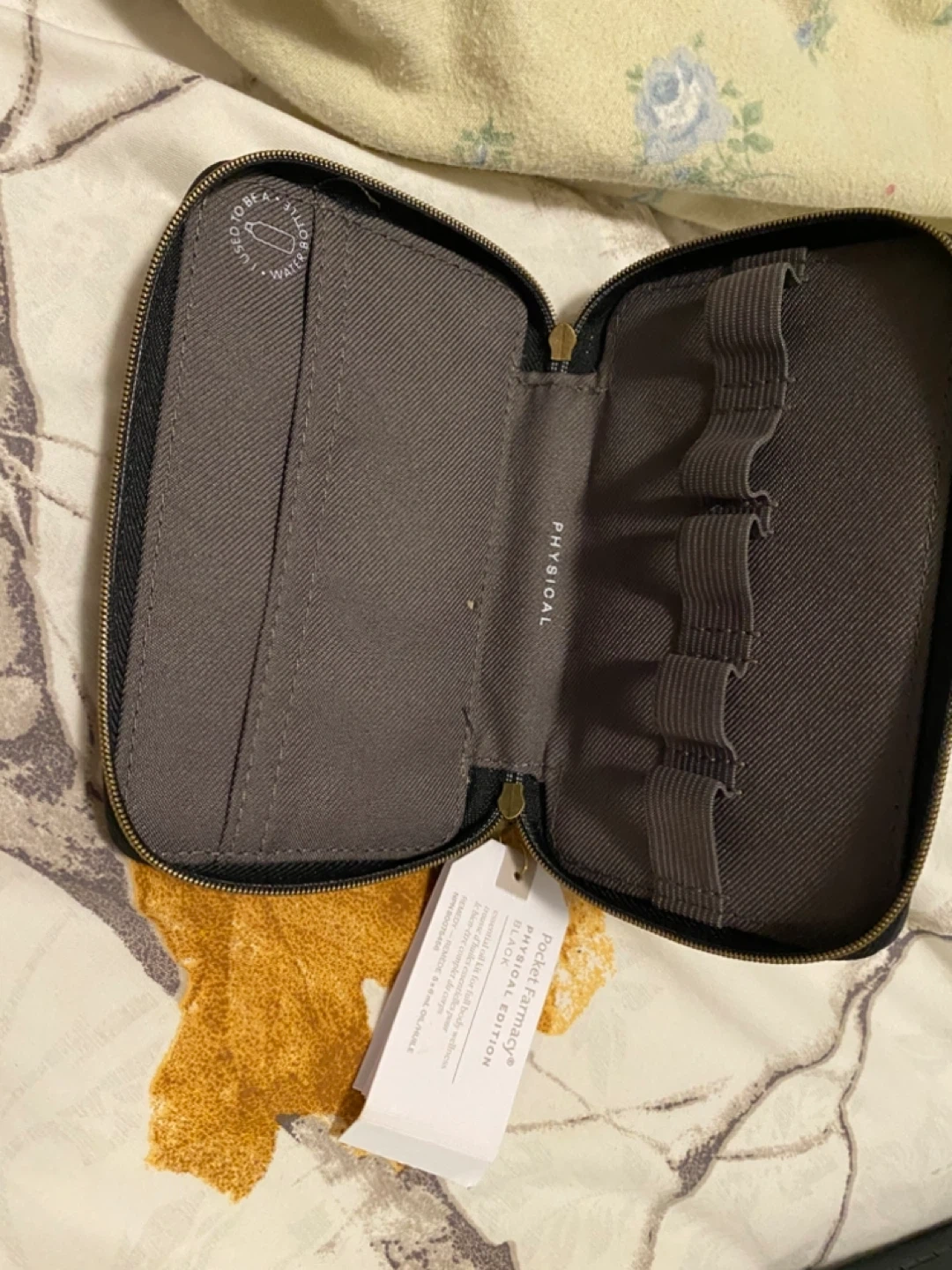 This is a black PocketPharmcy case, Physical Edition. It's made of faux leather and has elastic straps inside. Measures approximately 7 inches long and 4 inches wide.