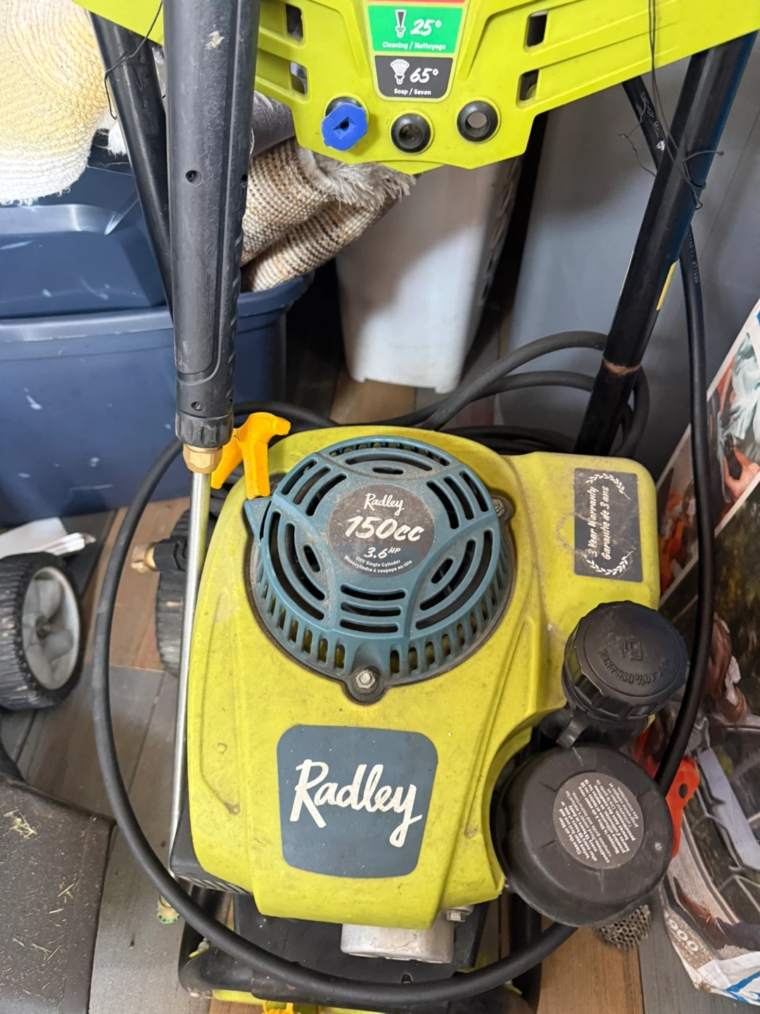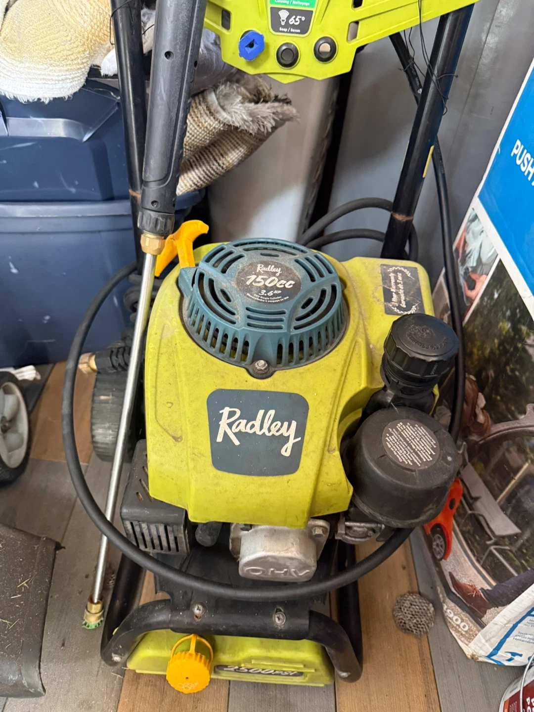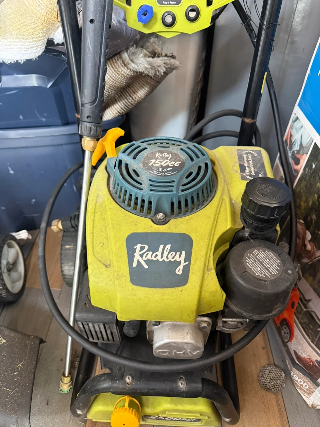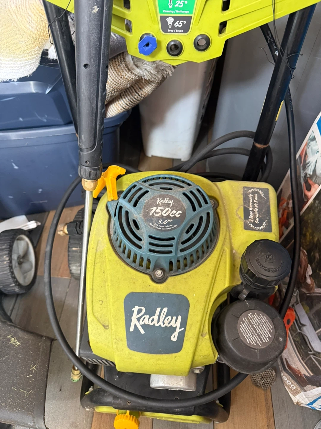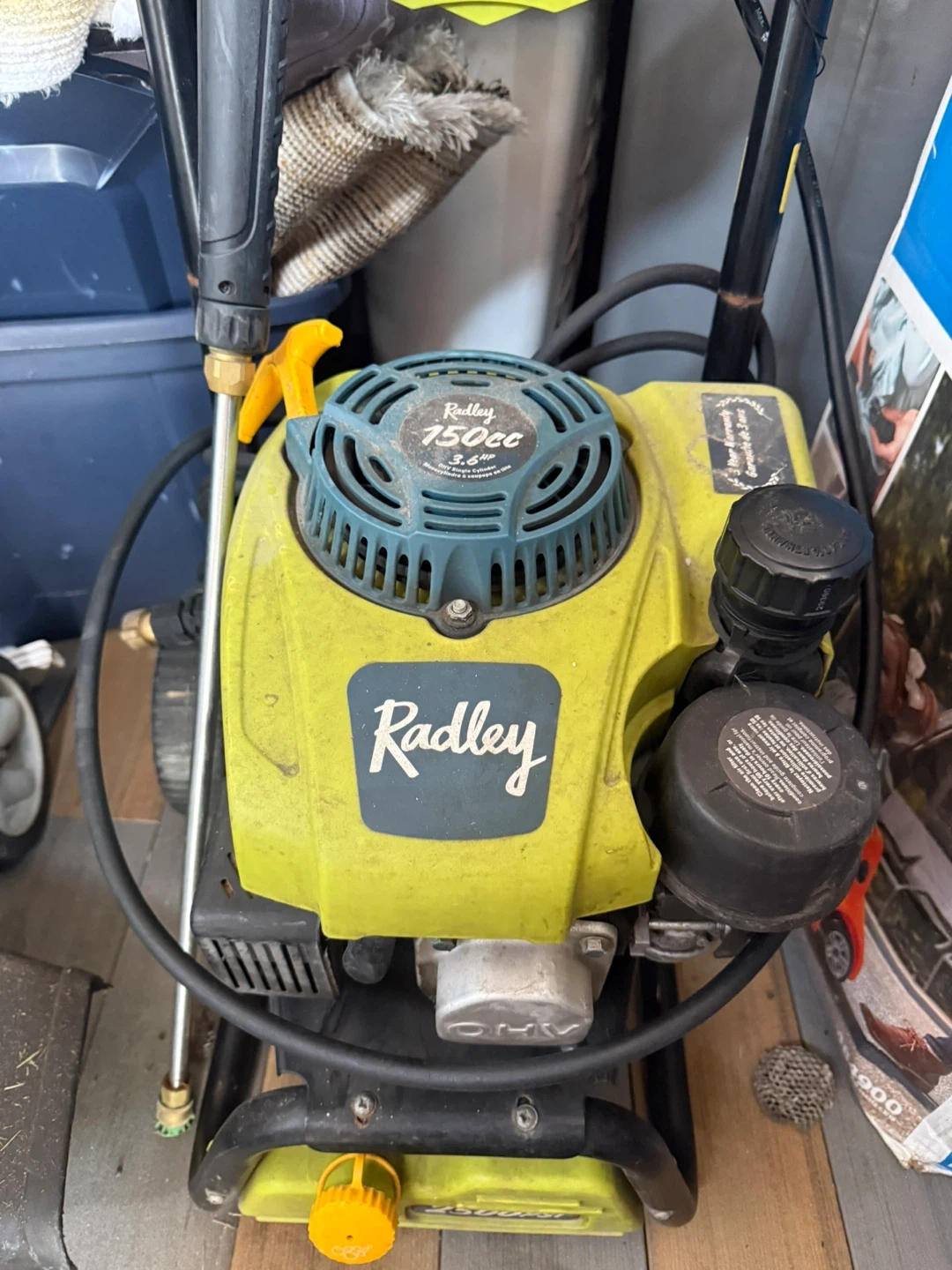 This is a Radley pressure washer with a 150cc engine and 3.6 GPM. It's great for cleaning driveways and siding. Includes original spray gun and hose.