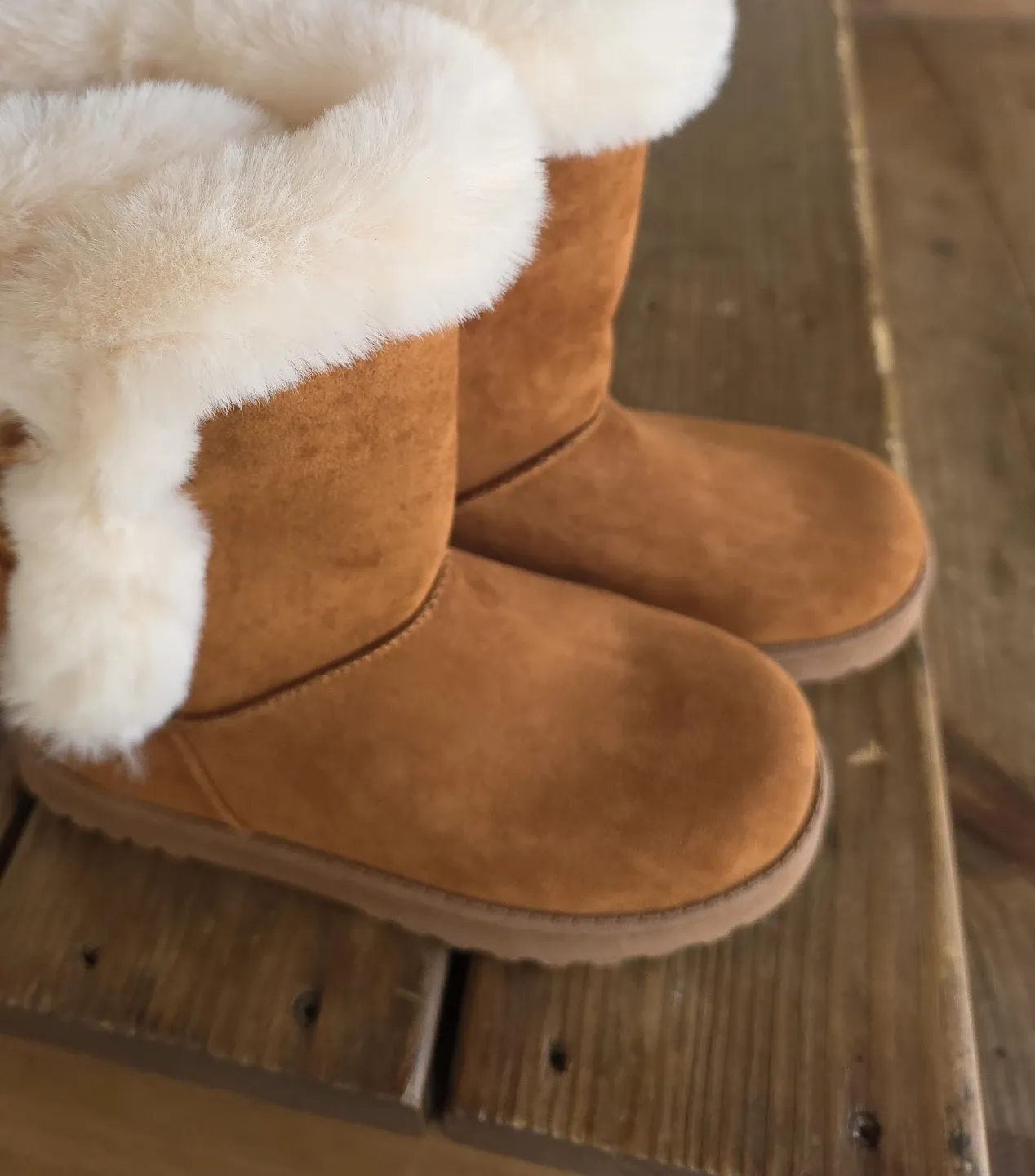 Cozy brown suede boots with a fluffy white shearling lining. These boots offer warmth and comfort for colder weather. Suede upper and shearling lining.
