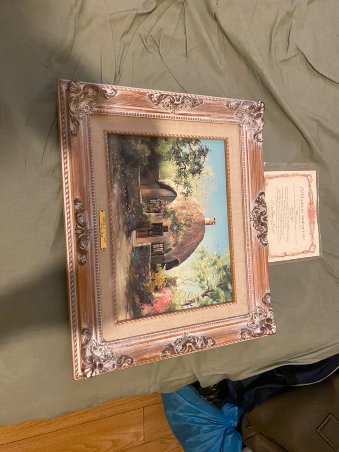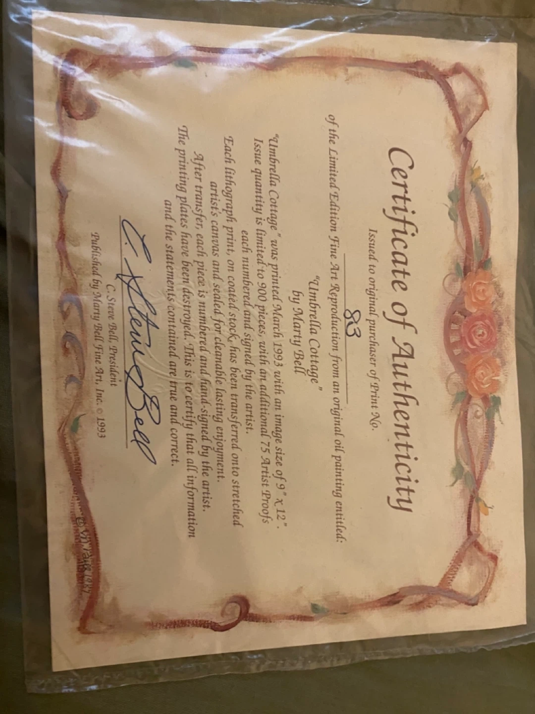 This is a limited edition fine art reproduction of "Umbrella Cottage" by Marty Bell. It's a 9"x12" print, part of a limited run of 900 pieces, numbered 83/900. The print is on coated stock, transferred onto canvas, and signed by the artist. A certificate of authenticity is included, confirming its original purchase in March 1993. This artwork would be a charming addition to any home decor.