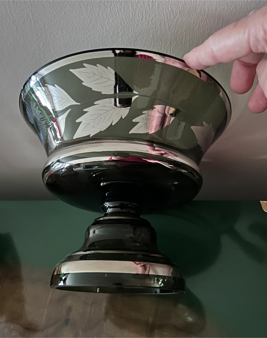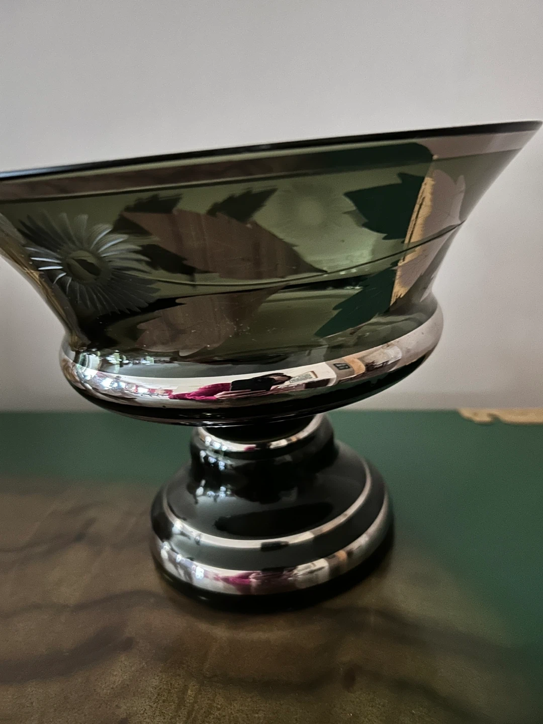 VINTAGE dark grey 8-inch glass bowl with etched floral and leaf designs, featuring silver-toned trim and a pedestal base. It's a lovely piece for serving or display. This would make a stylish addition to your tabletop decor!