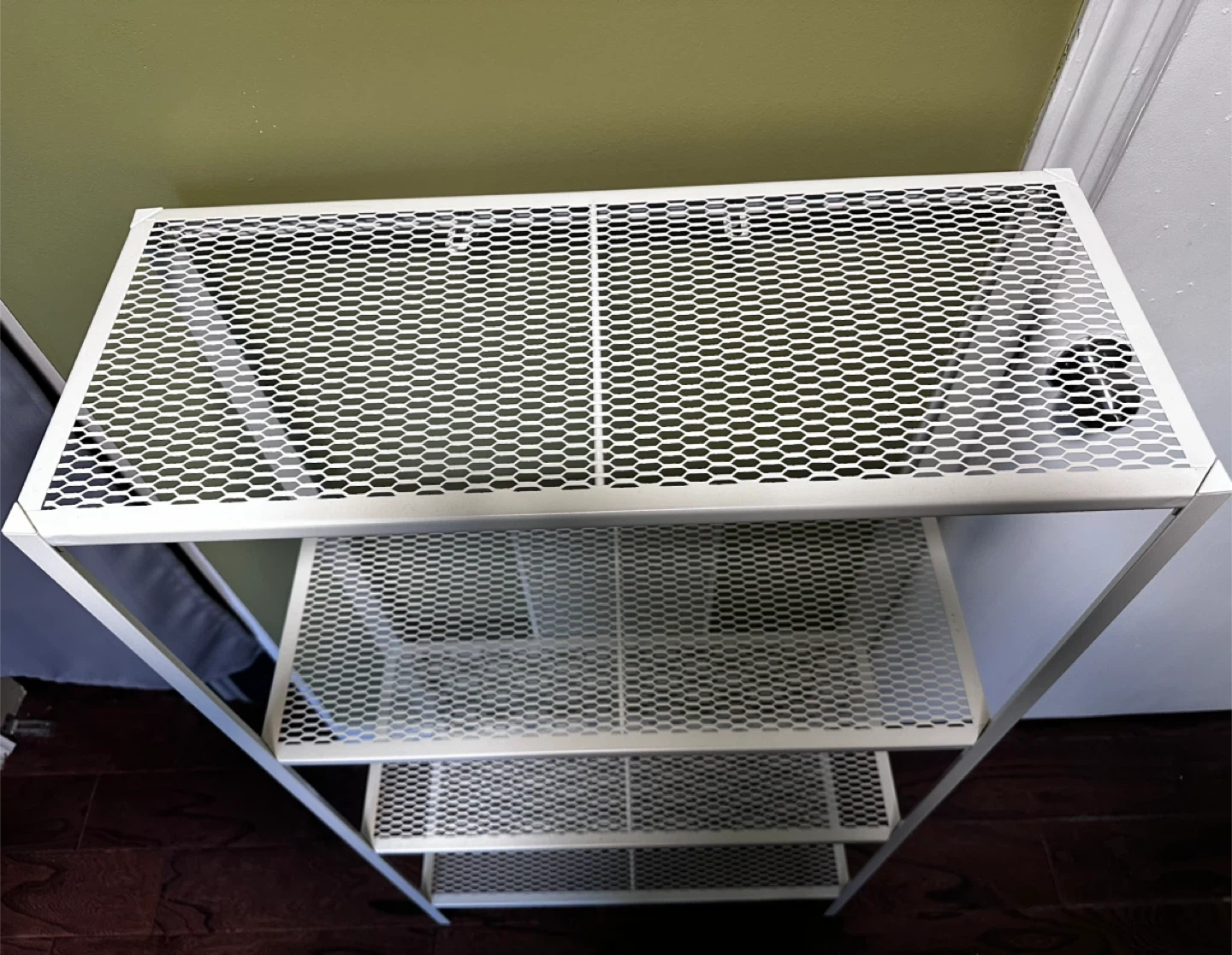 This is a white wire rack shelf unit with four shelves. It's made of metal with a mesh-like design on the shelves and back panel. It offers plenty of storage space for various items.
