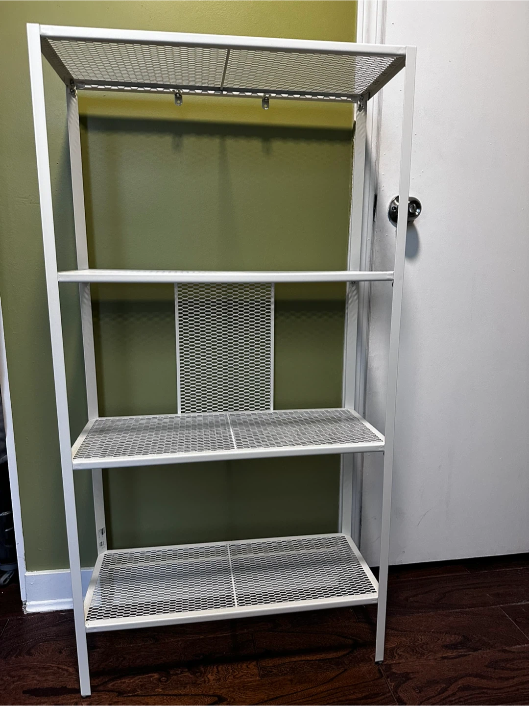 This is a white wire rack shelf unit with four shelves. It's made of metal with a mesh-like design on the shelves and back panel. It offers plenty of storage space for various items.