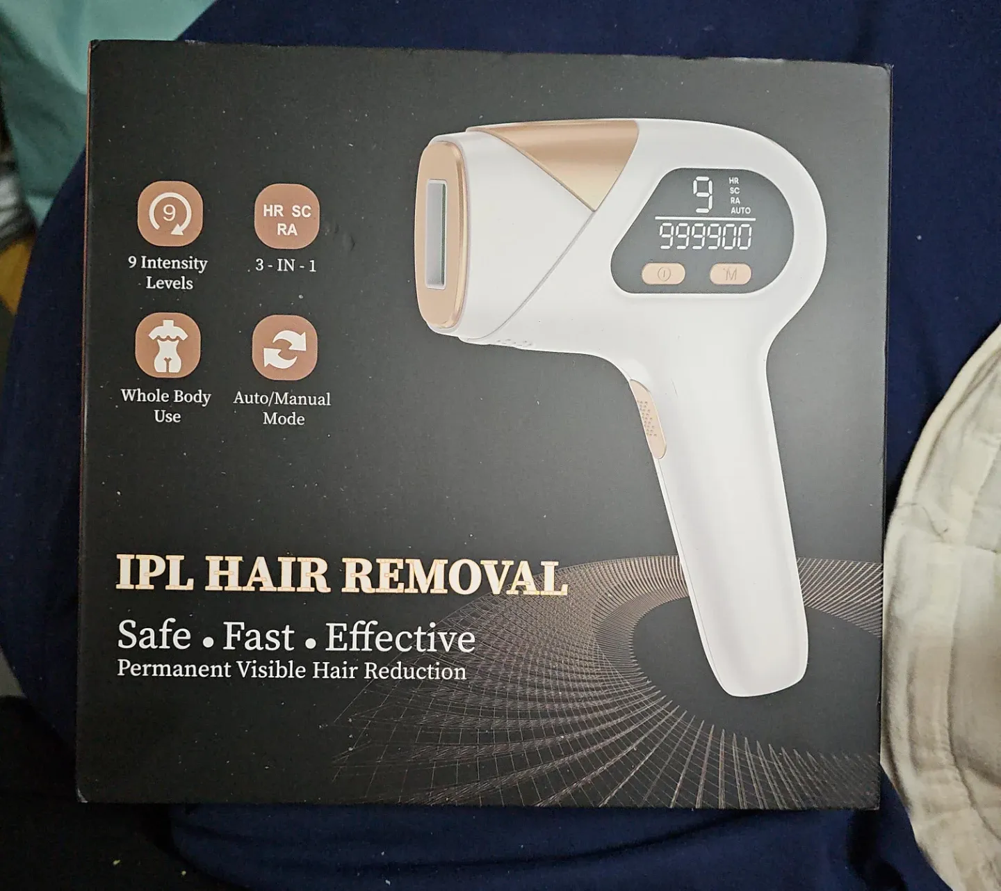 IPL hair removal device with 9 intensity levels. It's suitable for whole body use and features auto/manual modes. This device offers permanent visible hair reduction.