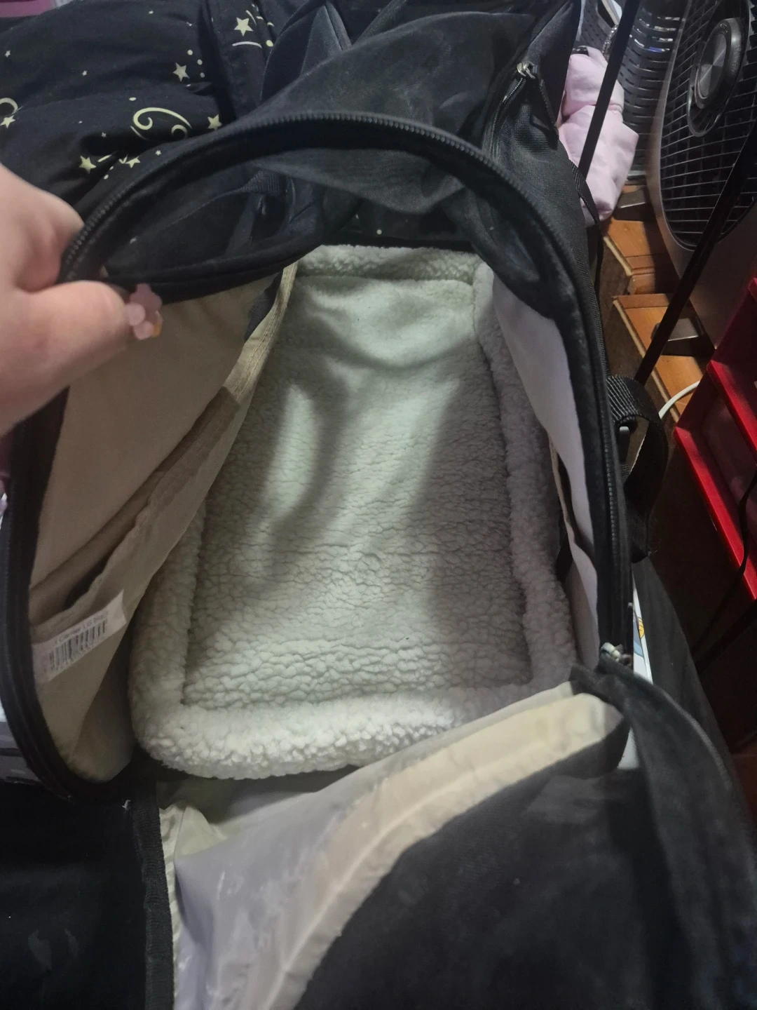 This is a black pet carrier bag. It's made from durable fabric and features mesh ventilation panels. The interior has a soft, plush lining. It's suitable for small pets.