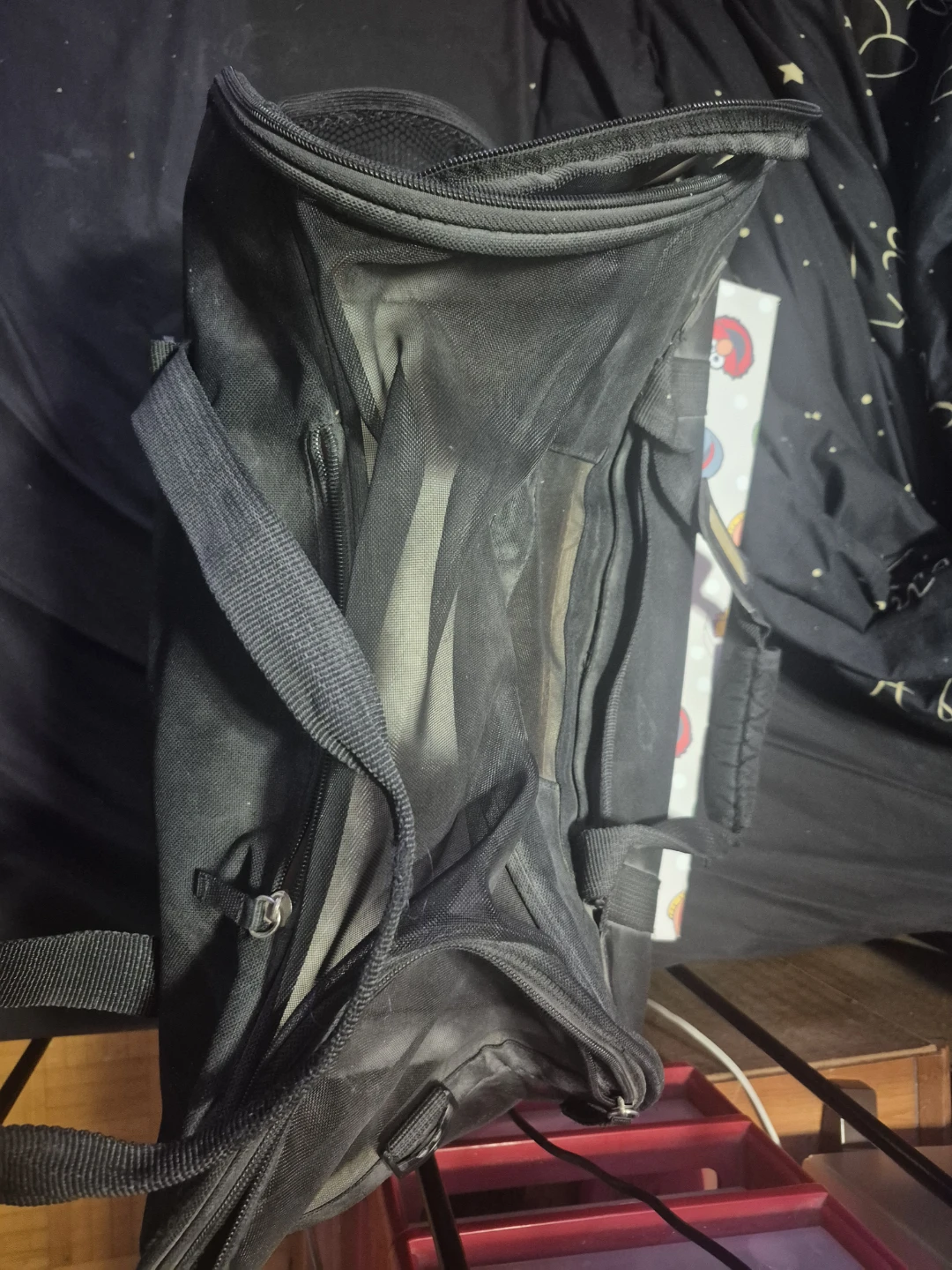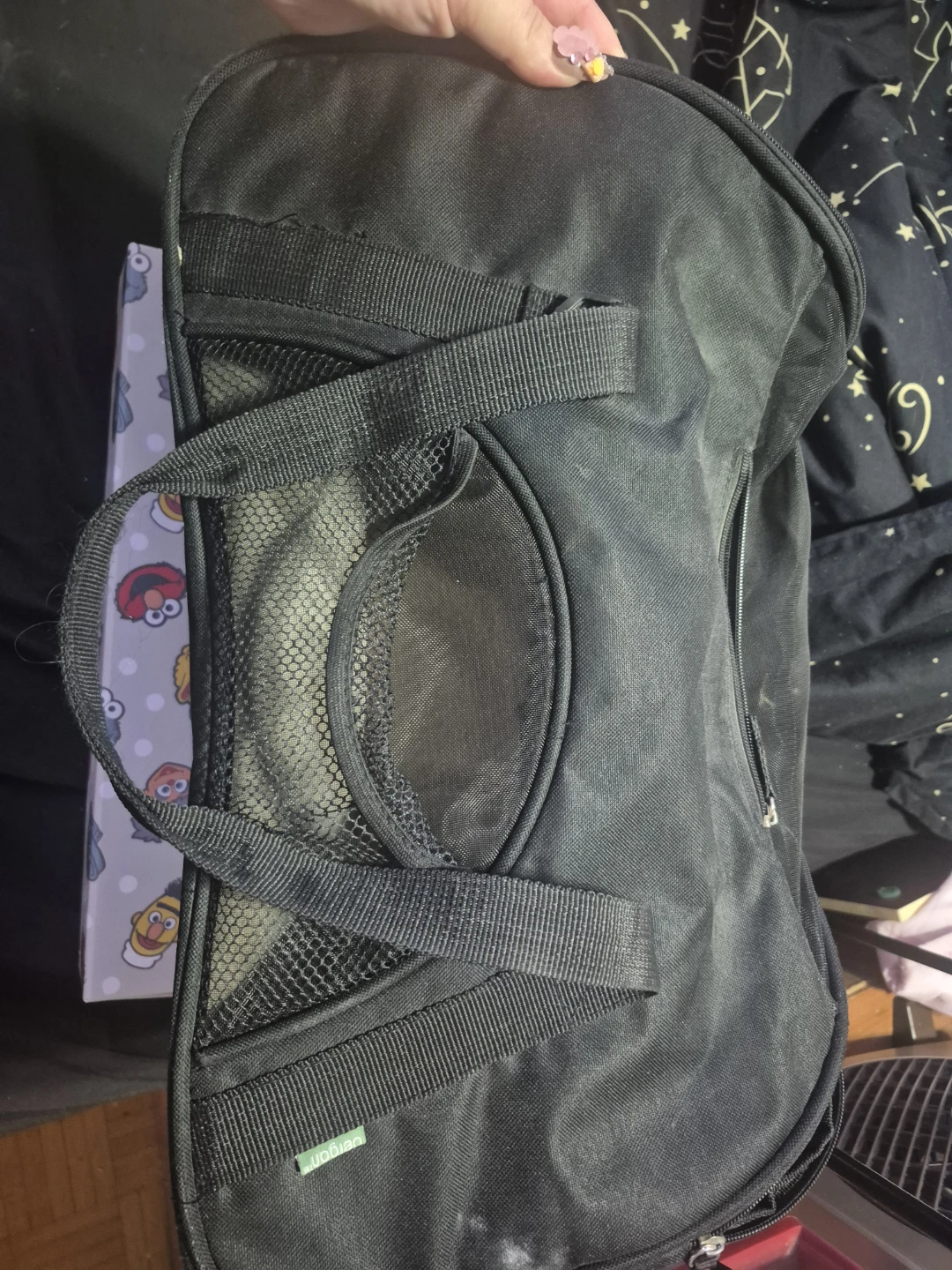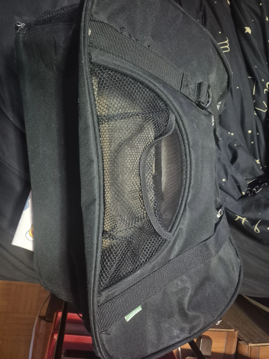 This is a black pet carrier bag. It's made from durable fabric and features mesh ventilation panels. The interior has a soft, plush lining. It's suitable for small pets.
