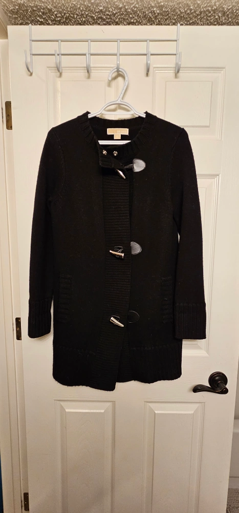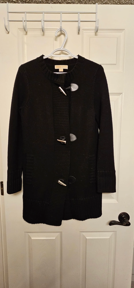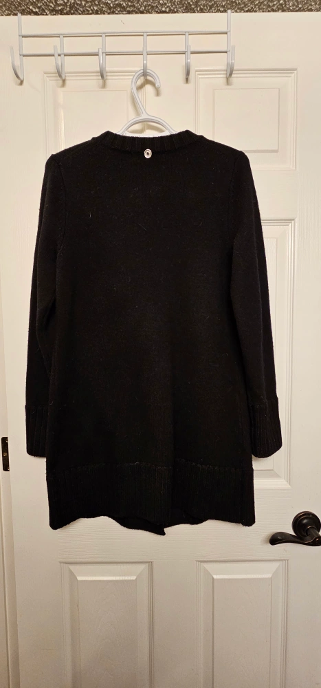 Black long-sleeved 97% merino wool sweater 3% spandex with a toggle closure. Size XS. Excellent used condition.