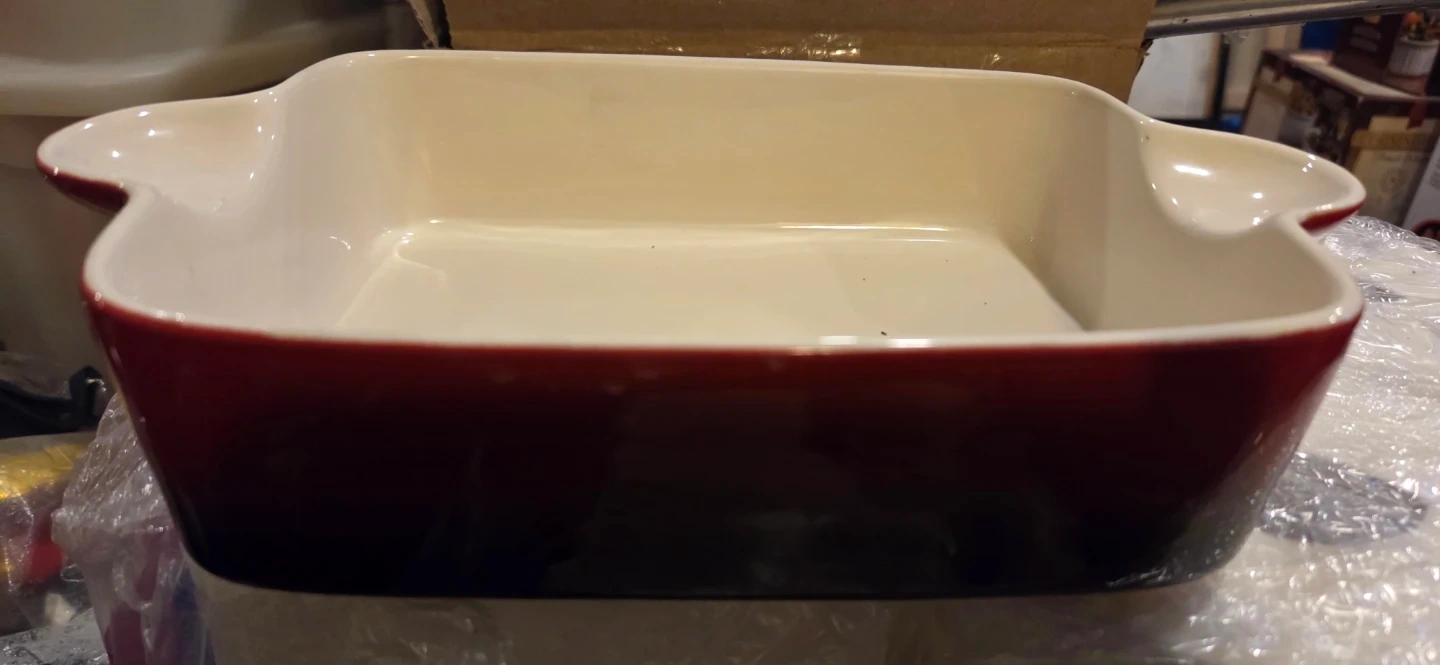A nice ceramic baking dish in a rich red colour with a cream interior. It has lovely tab handles for easy gripping. Perfect for making your favourite casseroles and roasts!