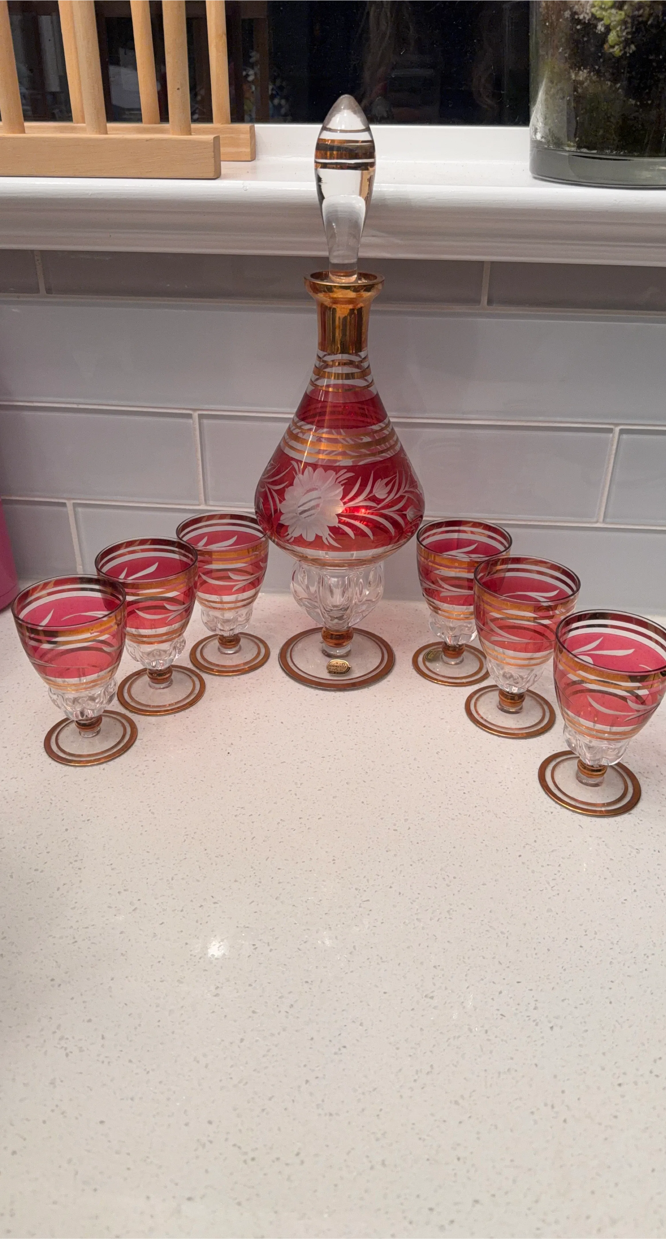Beautiful vintage Bohemian glass decanter set with six matching glasses. The set features a lovely red and gold design. Perfect for adding a touch of elegance to your home bar or as a decorative piece!