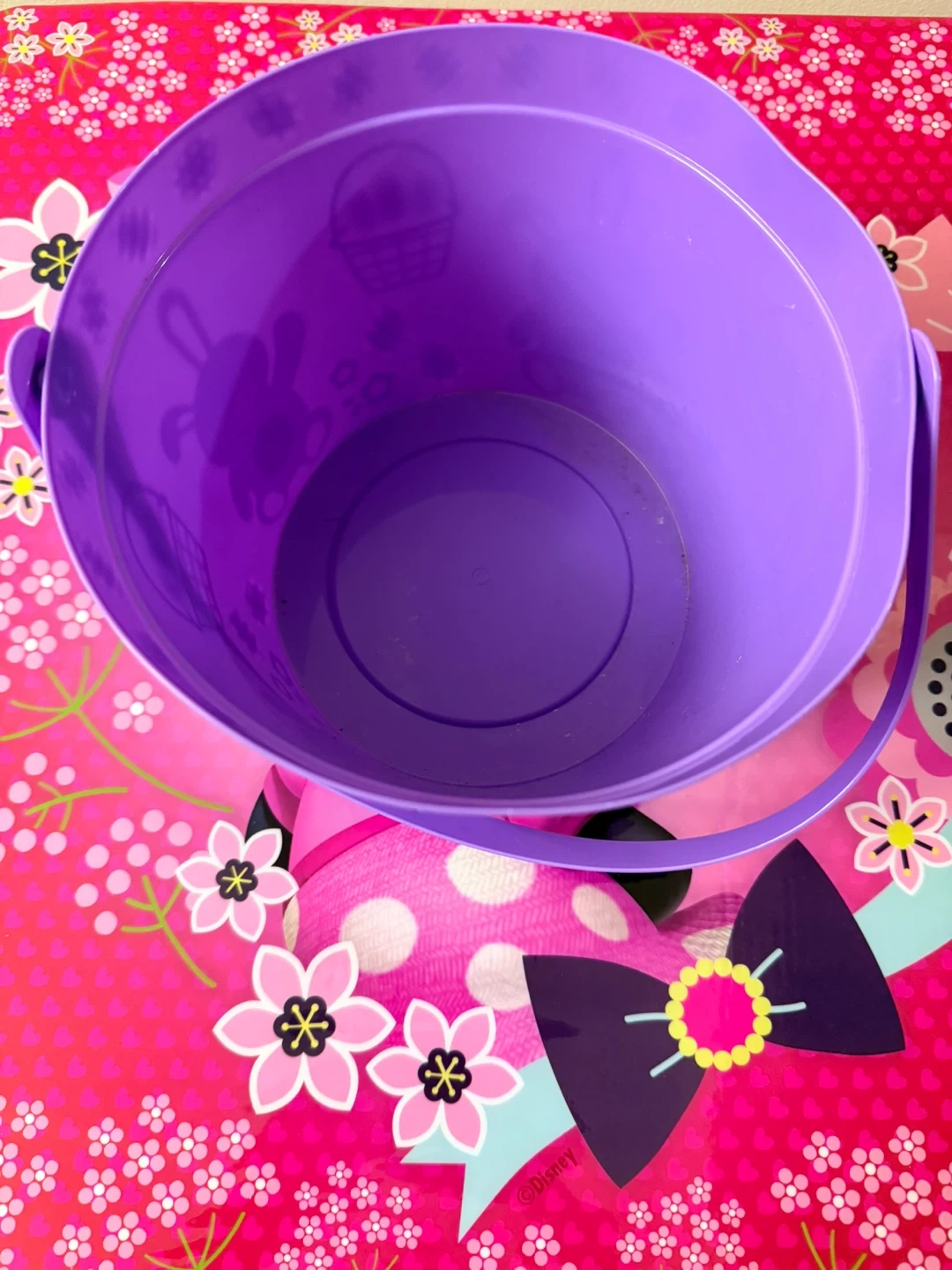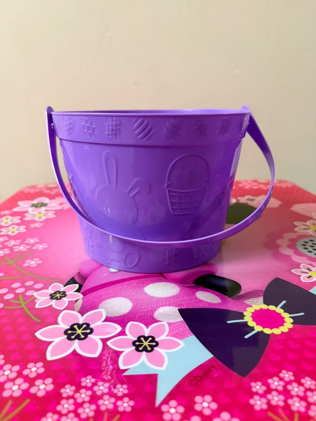 A purple plastic Easter bucket with embossed bunny and basket designs. It's perfect for collecting Easter eggs or carrying small treats.