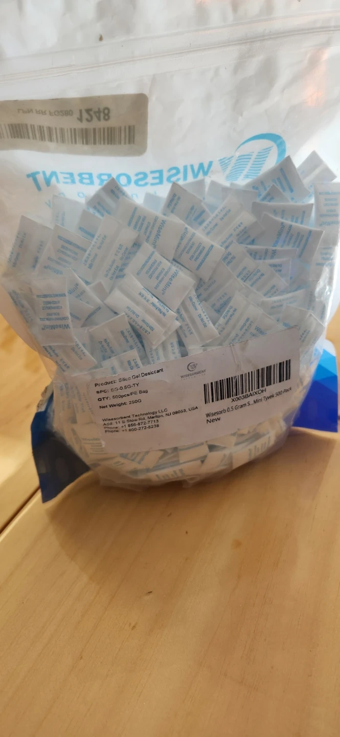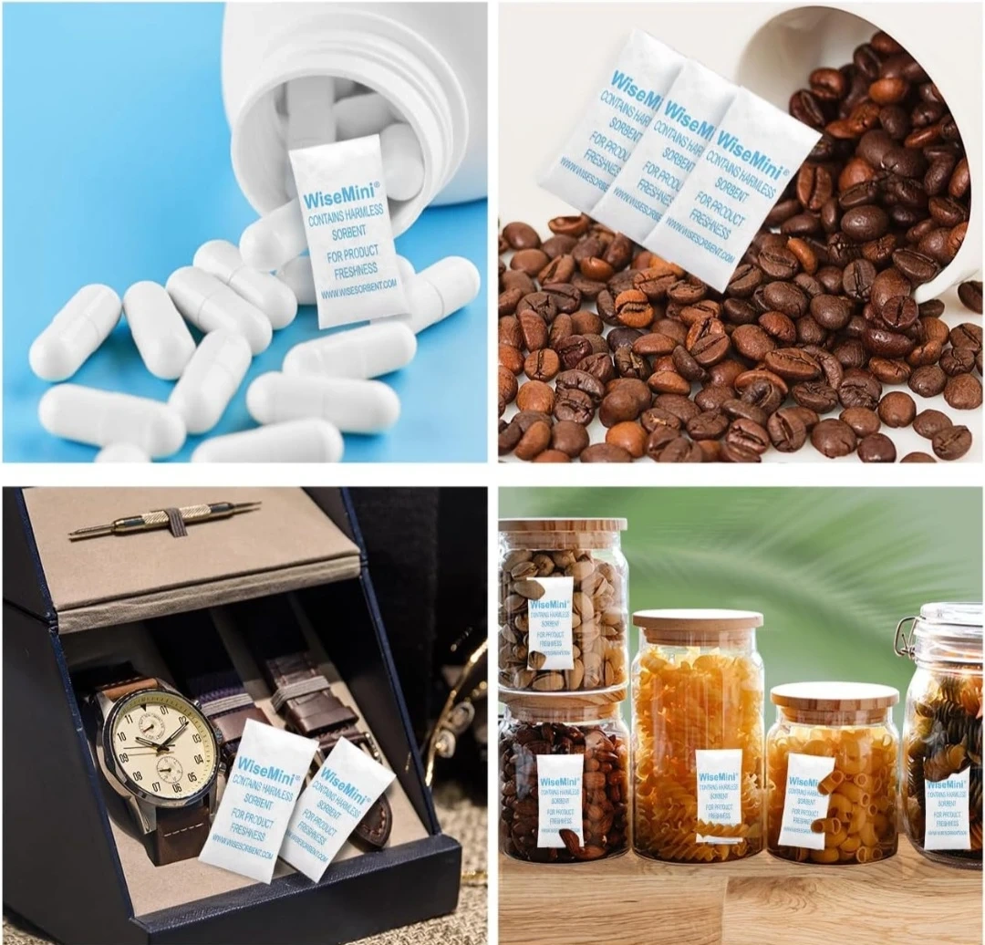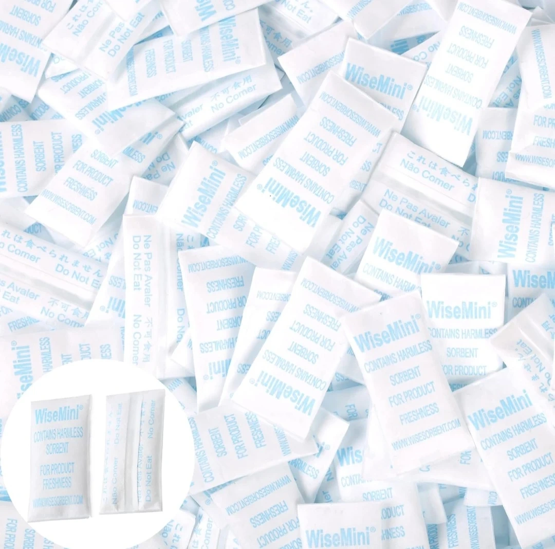 A bag of 250g of WiseMini silica gel desiccant packets. Each packet contains harmless sorbent for product freshness. These packets are commonly used to protect items like electronics, food, and collectibles from moisture damage. Protect your belongings from humidity!