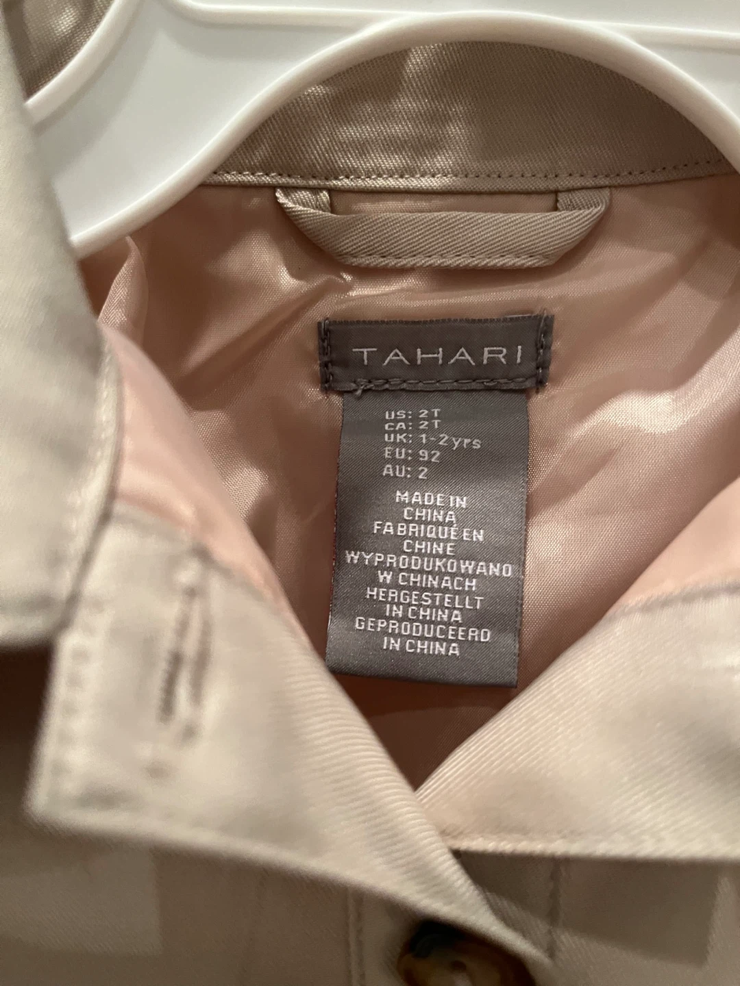 A cute Tahari trench coat for girls in size 2T! This stylish coat is in excellent condition and features a classic design with a button-up front. Beautiful details in the design and buttons