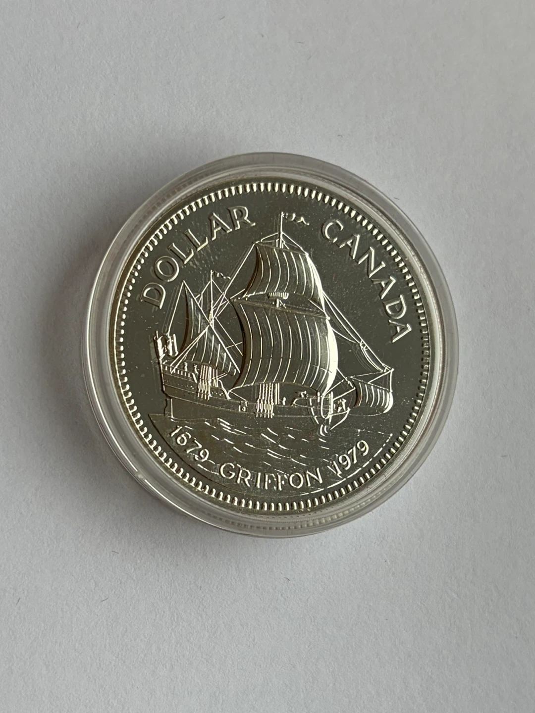 Selling a 1979 Canadian silver dollar coin featuring The Griffon ship. It's in great condition and comes in its original case. A nice addition to any coin collection!
