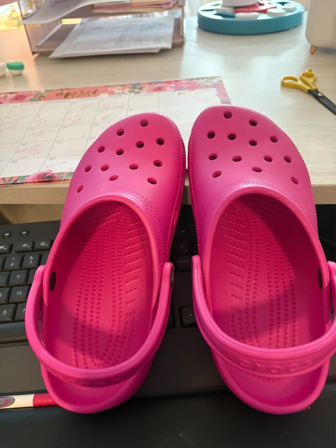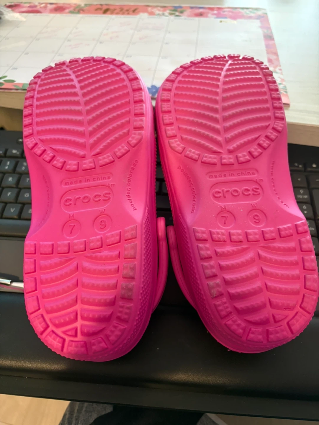 These are classic pink Crocs, women's size 9, or men's size 7. They're great for easy slip-on comfort.