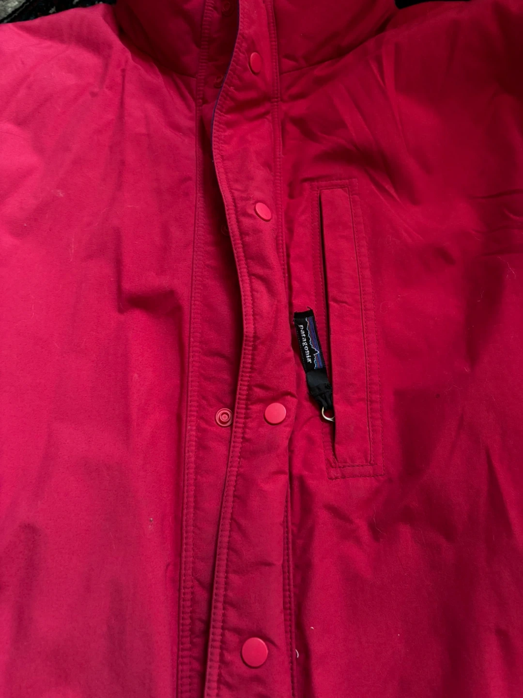 Here's a red Patagonia jacket! It's in good condition and perfect for cooler weather. It features a full button closure and a small chest pocket with the Patagonia logo. The inside is lined for extra warmth