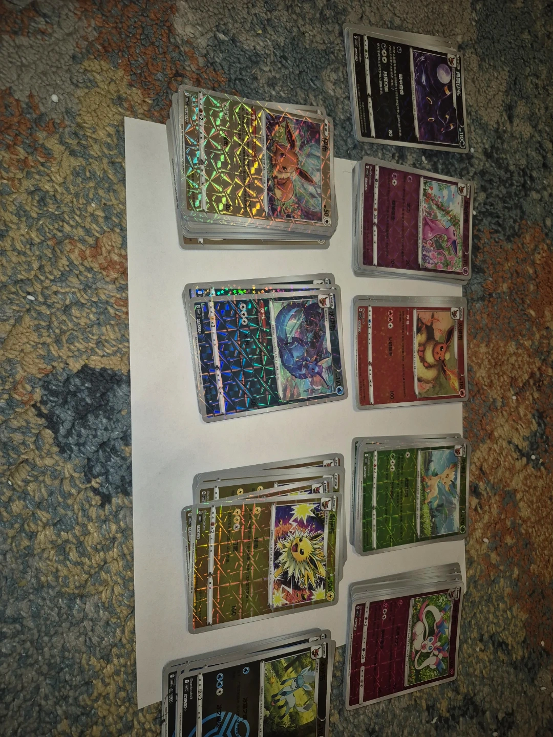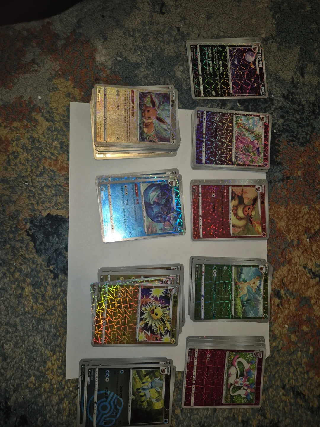 Collection of various Pokemon trading cards featuring Eevee and other characters. Includes several holofoil and holographic cards in good condition.