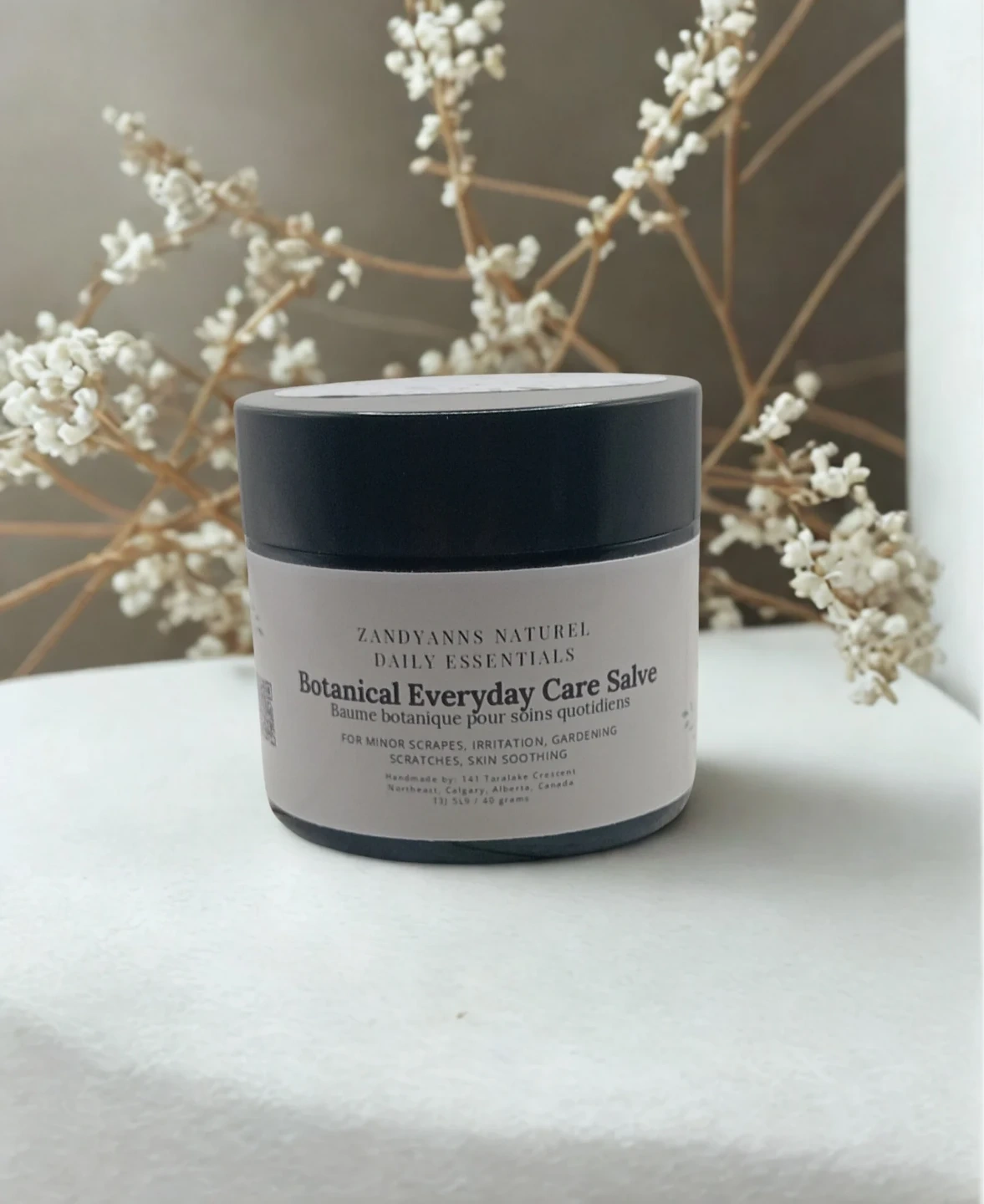 Zandanny's Naturel Botanical Everyday Care Salve. Made with calendula flower extract, lavender and tea tree essential oil. This salve is formulated for minor scrapes, irritation, gardening, and skin soothing. Made in Calgary, Alberta, Canada.