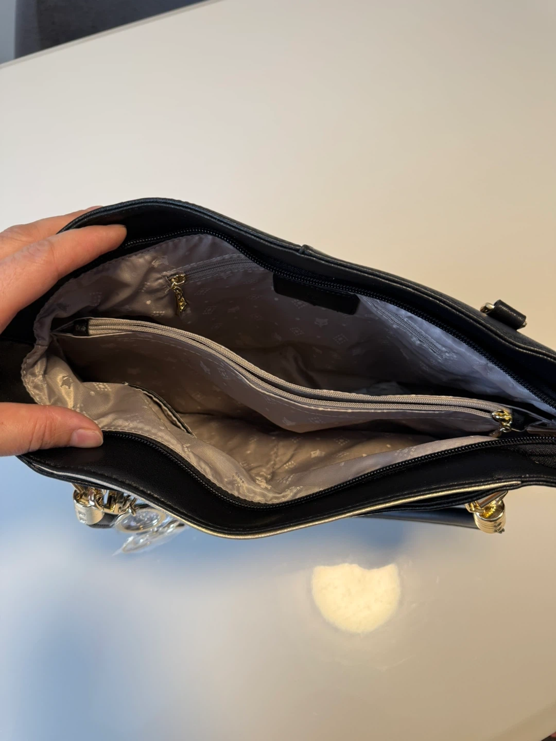 This black tote handbag features gold-toned hardware and a decorative charm. It has a zip closure and an interior zip pocket. The material appears to be faux leather.