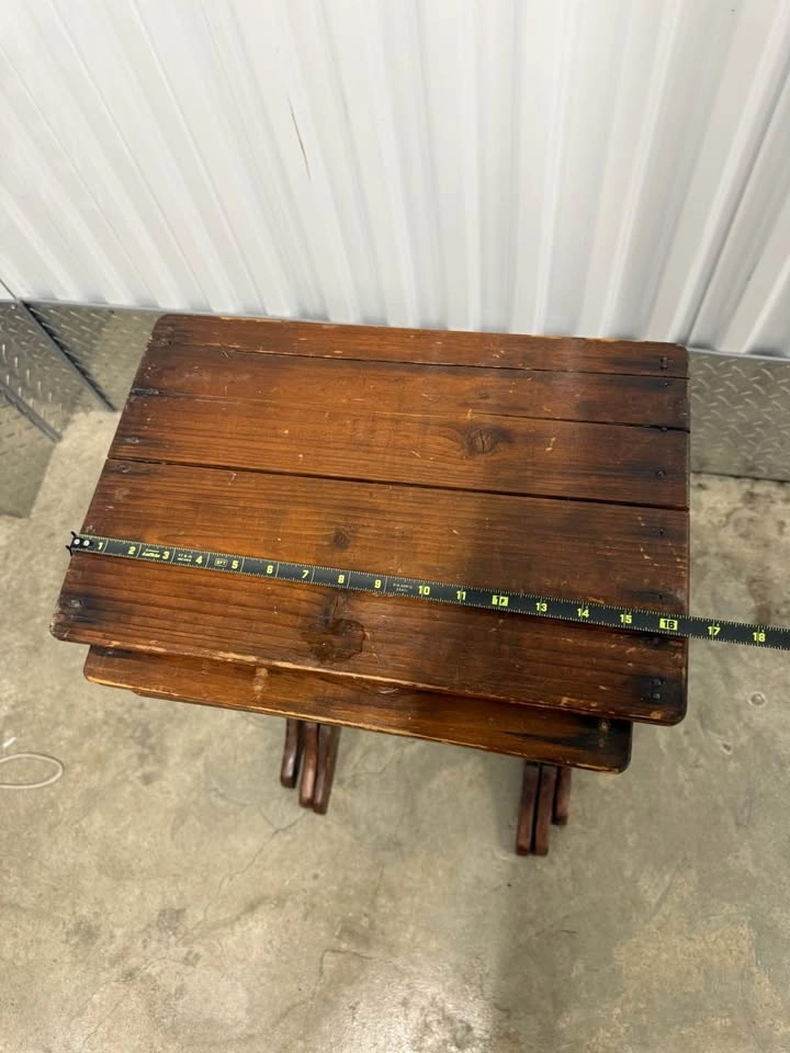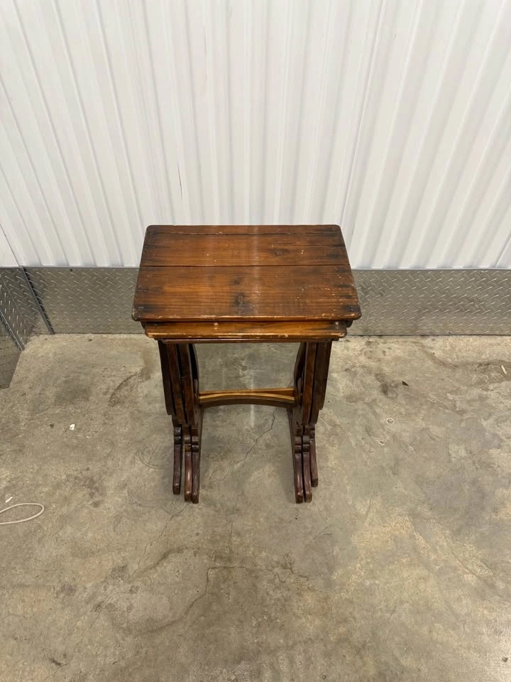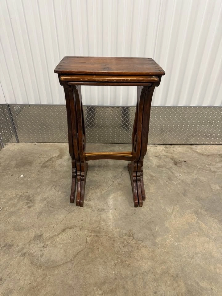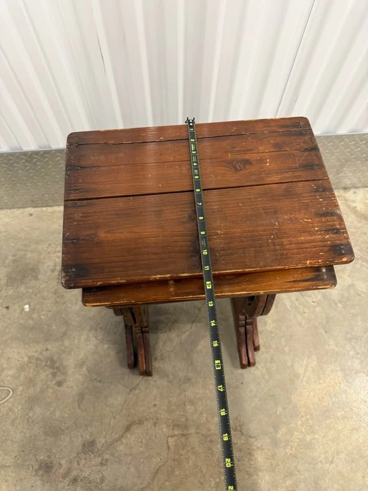 Stackable solid wood side tables featuring gothic-inspired cutout details. Great character and patina. Perfect as an accent table, plant stand, or statement piece. They definitely show use but the character is there. Height roughly 26”, tops are 16”x11”. Pickup in Prospect Park. Thanks for looking!