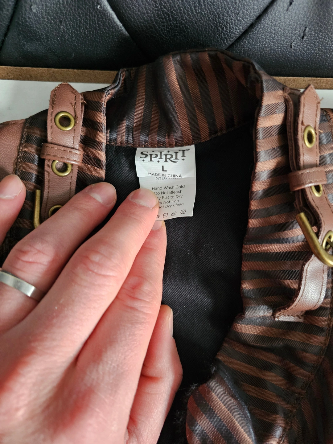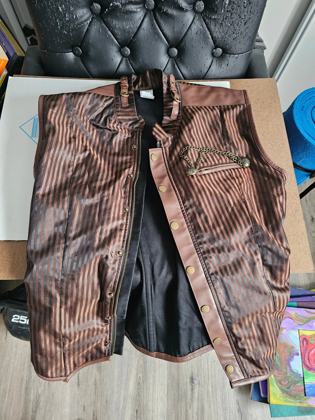 Selling a steampunk-style vest from Spirit Halloween! It features a striped brown and black pattern with faux leather accents and decorative chains. Perfect for completing your steampunk or costume look!