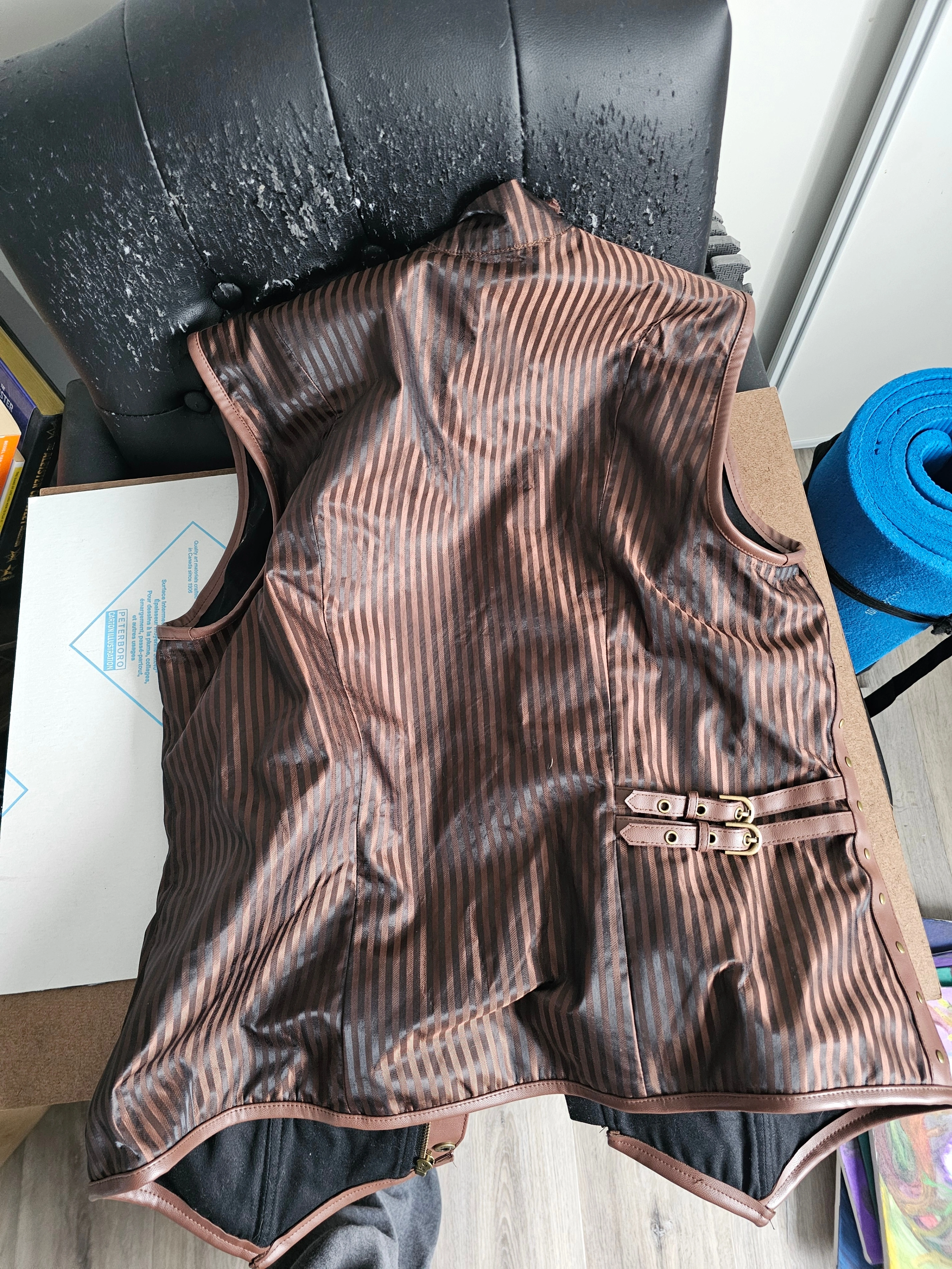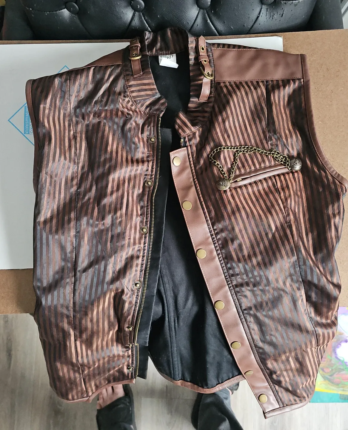 Selling a steampunk-style vest from Spirit Halloween! It features a striped brown and black pattern with faux leather accents and decorative chains. Perfect for completing your steampunk or costume look!