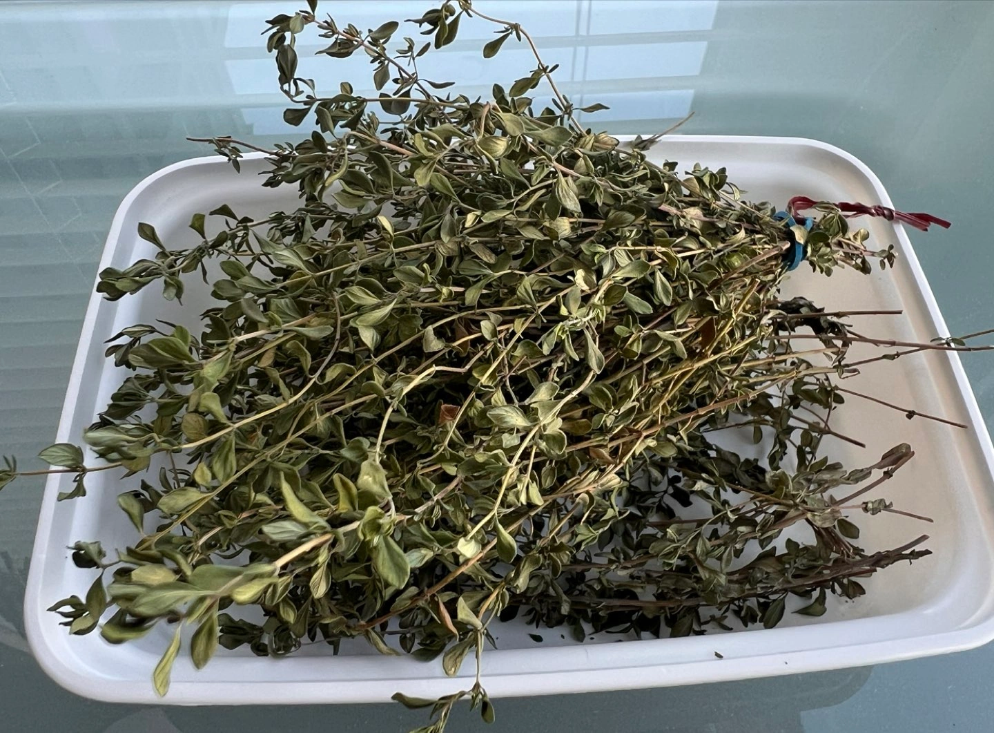 A handful of washed and dried thyme. Great for use in many things like soups, steak seasoning, sauces, roasted vegetables, pasta, pizza, and tea! π« π π π²