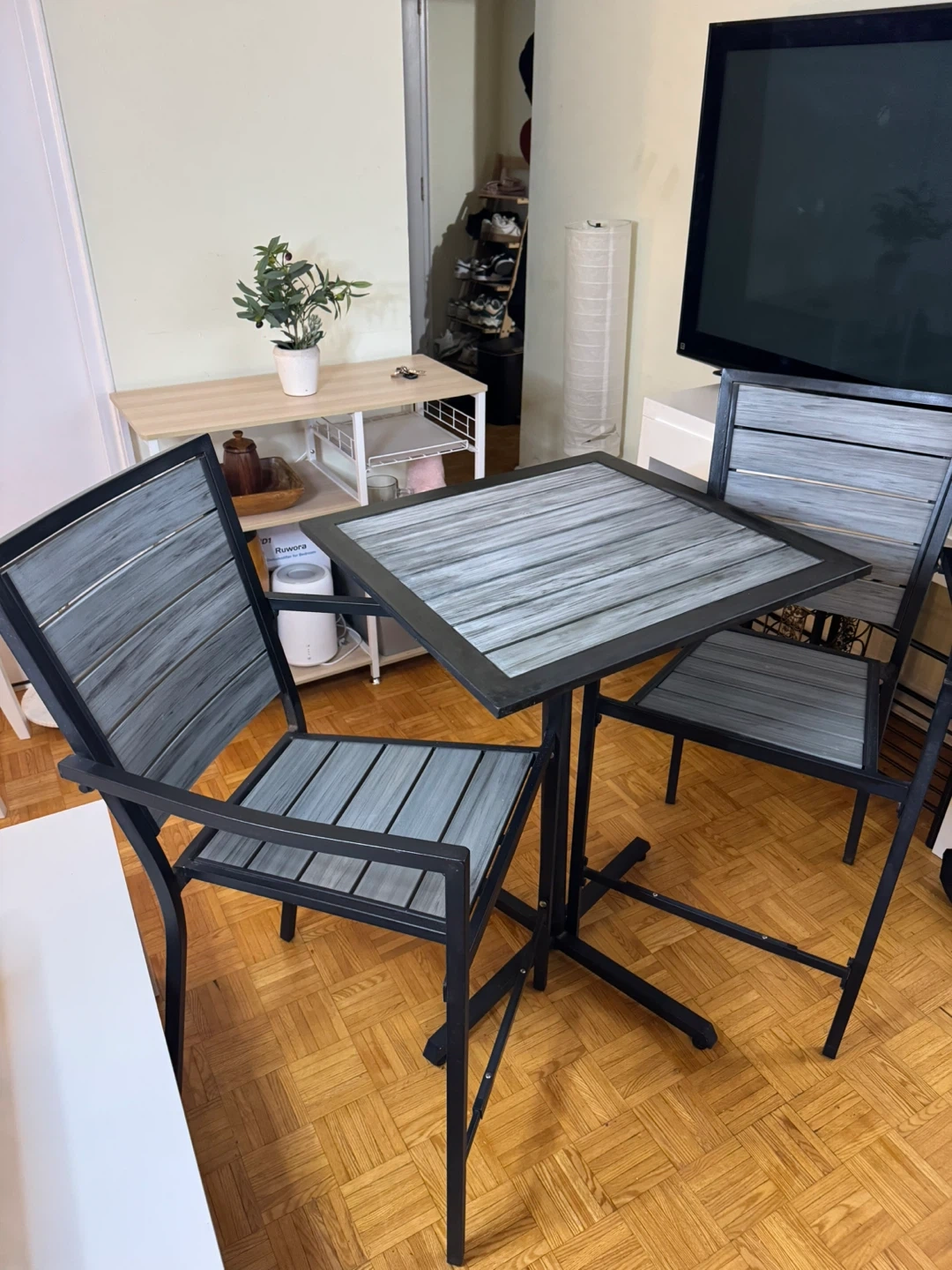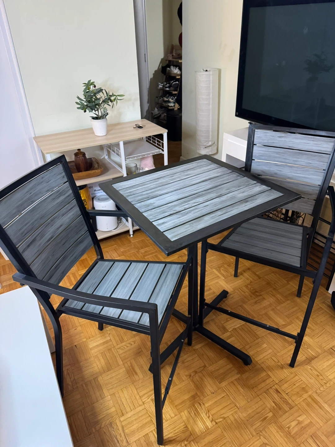 Selling a patio set that includes a square table and two chairs. The set features a grey wood-look top and seat with a black metal frame. It's perfect for a small balcony or patio!