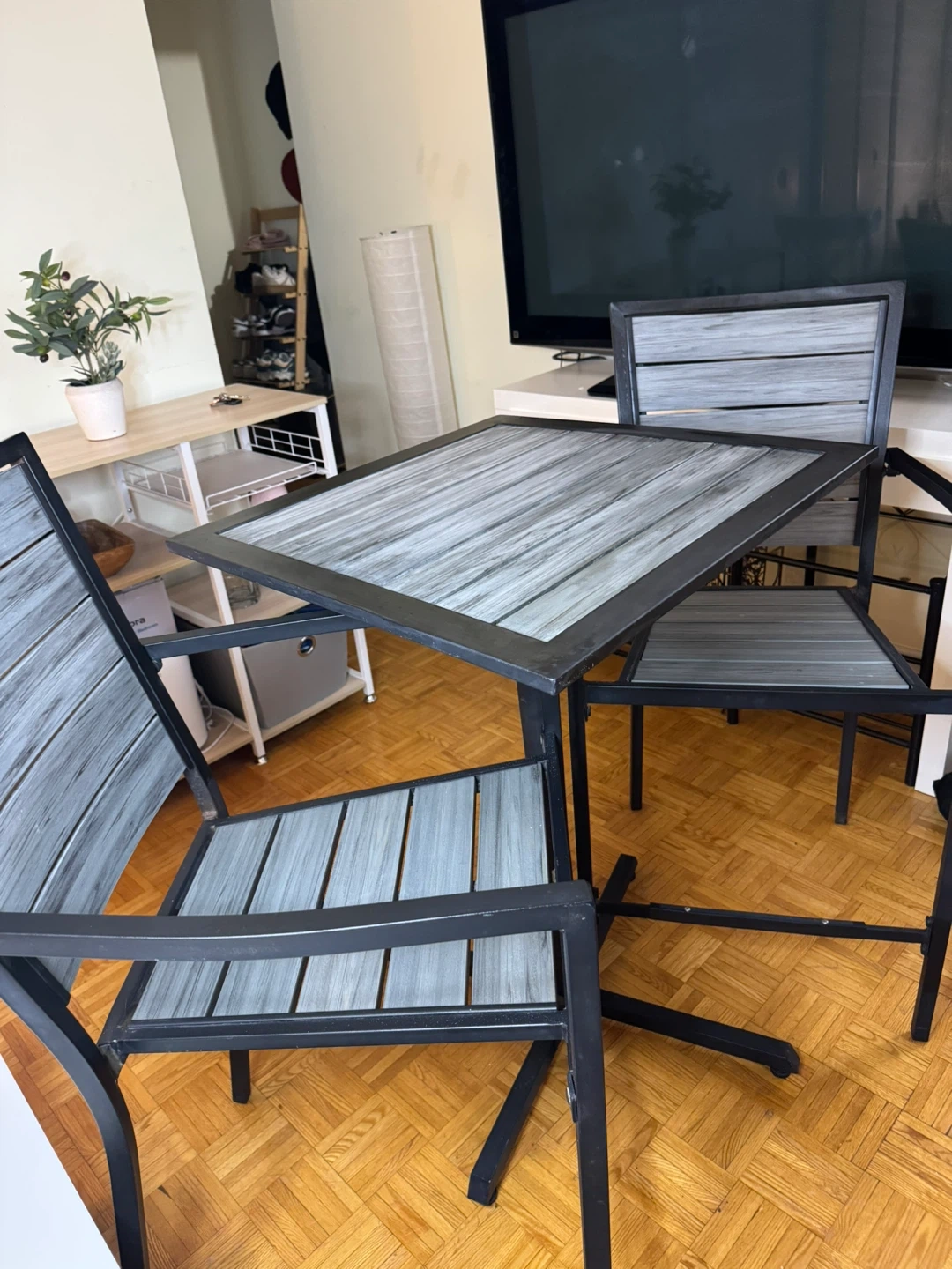 Selling a patio set that includes a square table and two chairs. The set features a grey wood-look top and seat with a black metal frame. It's perfect for a small balcony or patio!