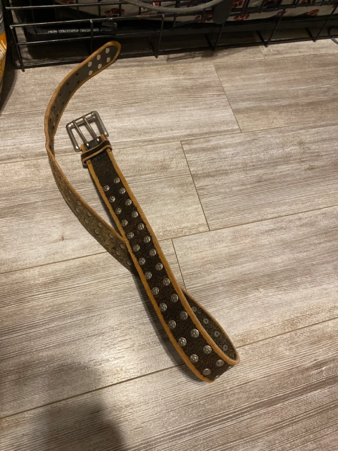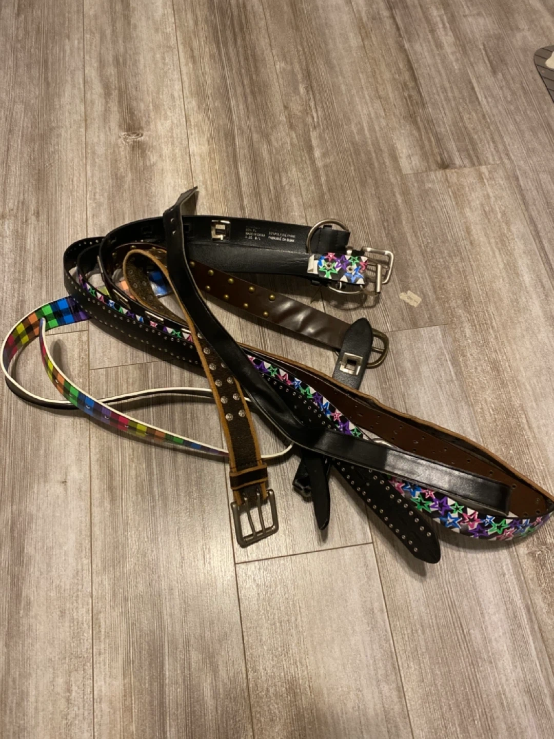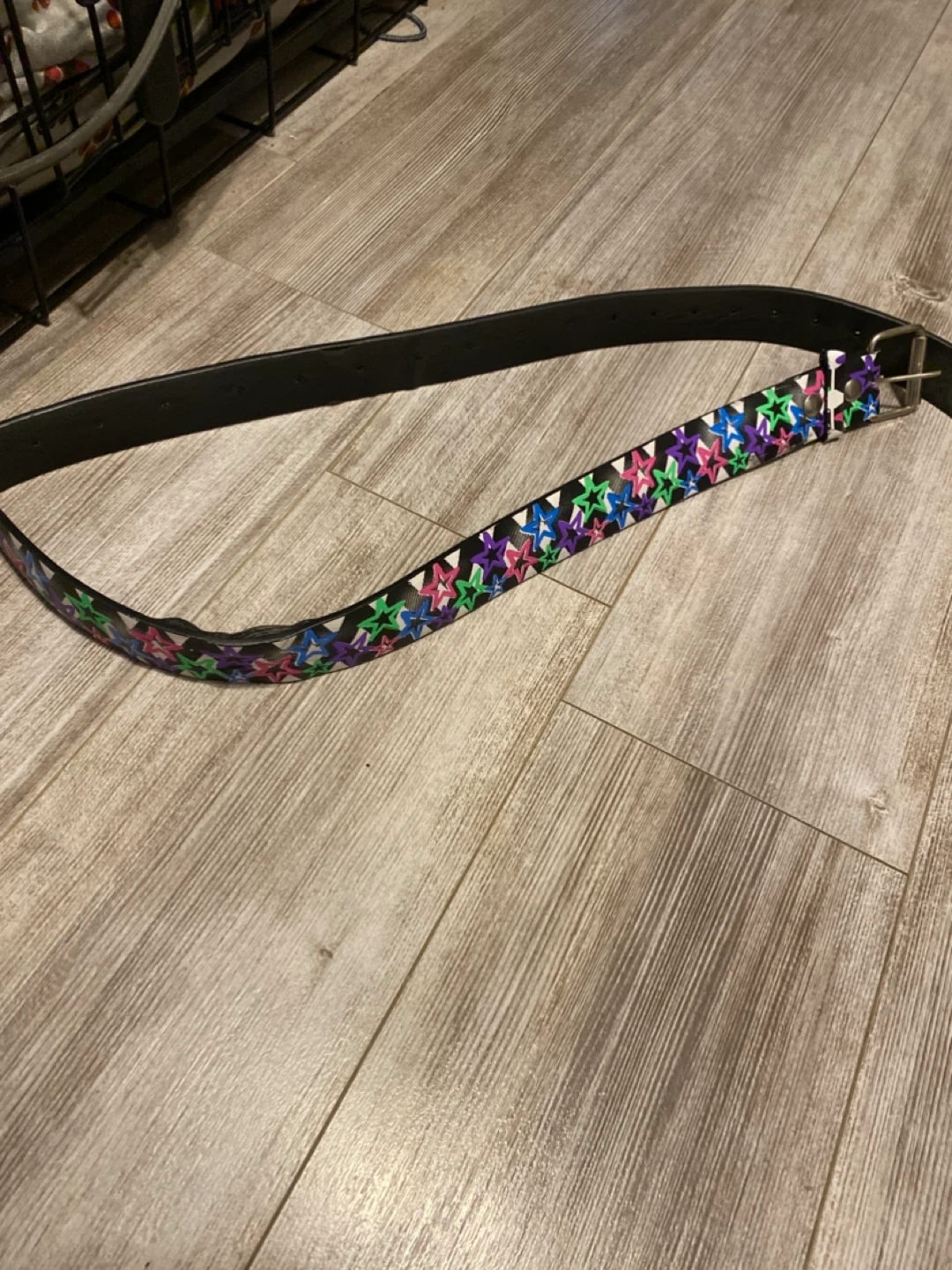 Includes one black studded belt with a silver buckle. Also includes two fabric belts, one with a star pattern and one with a plaid design. All belts are in good condition.